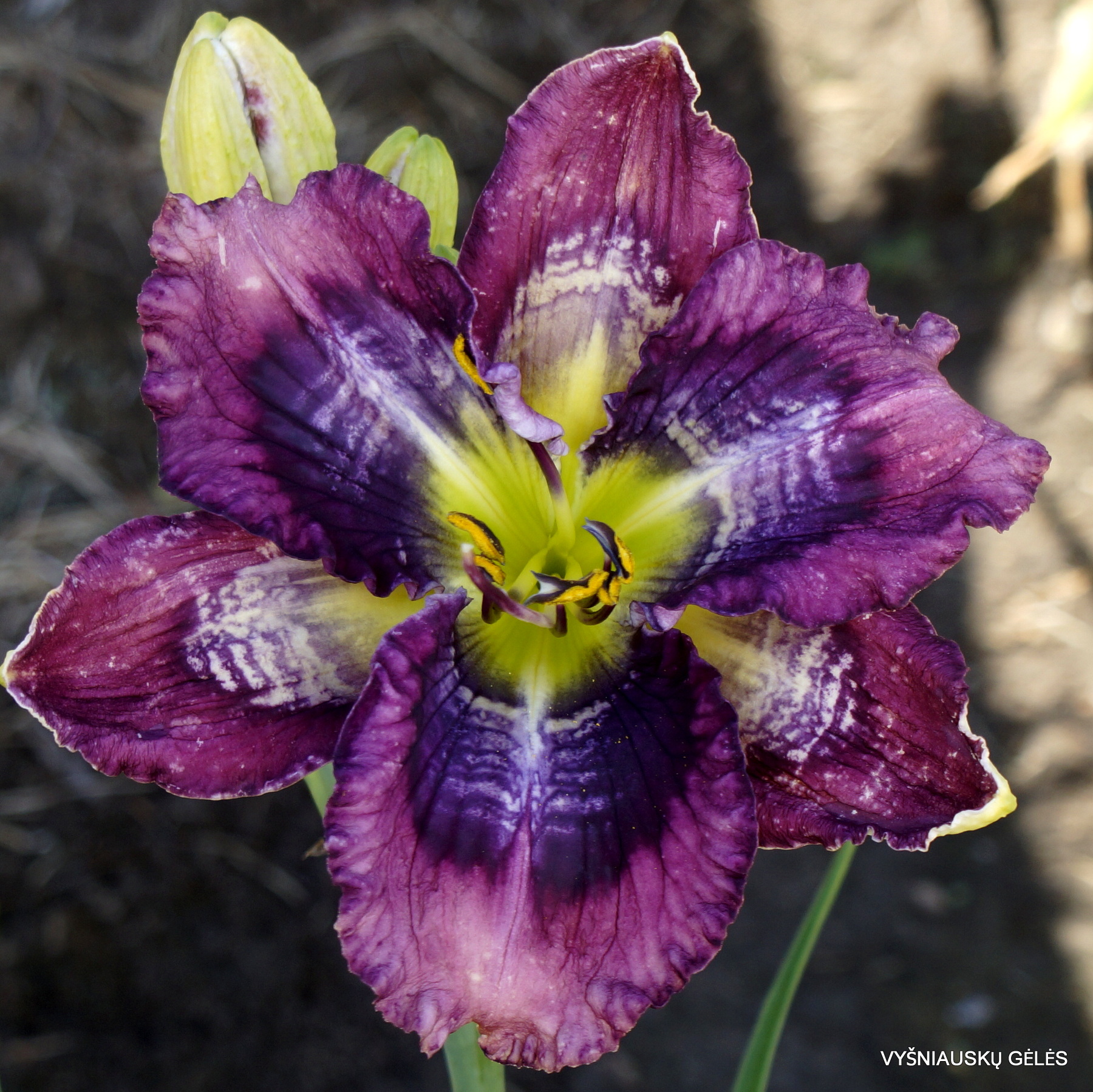 Žiedai nemaži (17 cm skersmens) purpuriniai su tamsiai purpurine, raibuliuojančia akimi. A – 70 cm