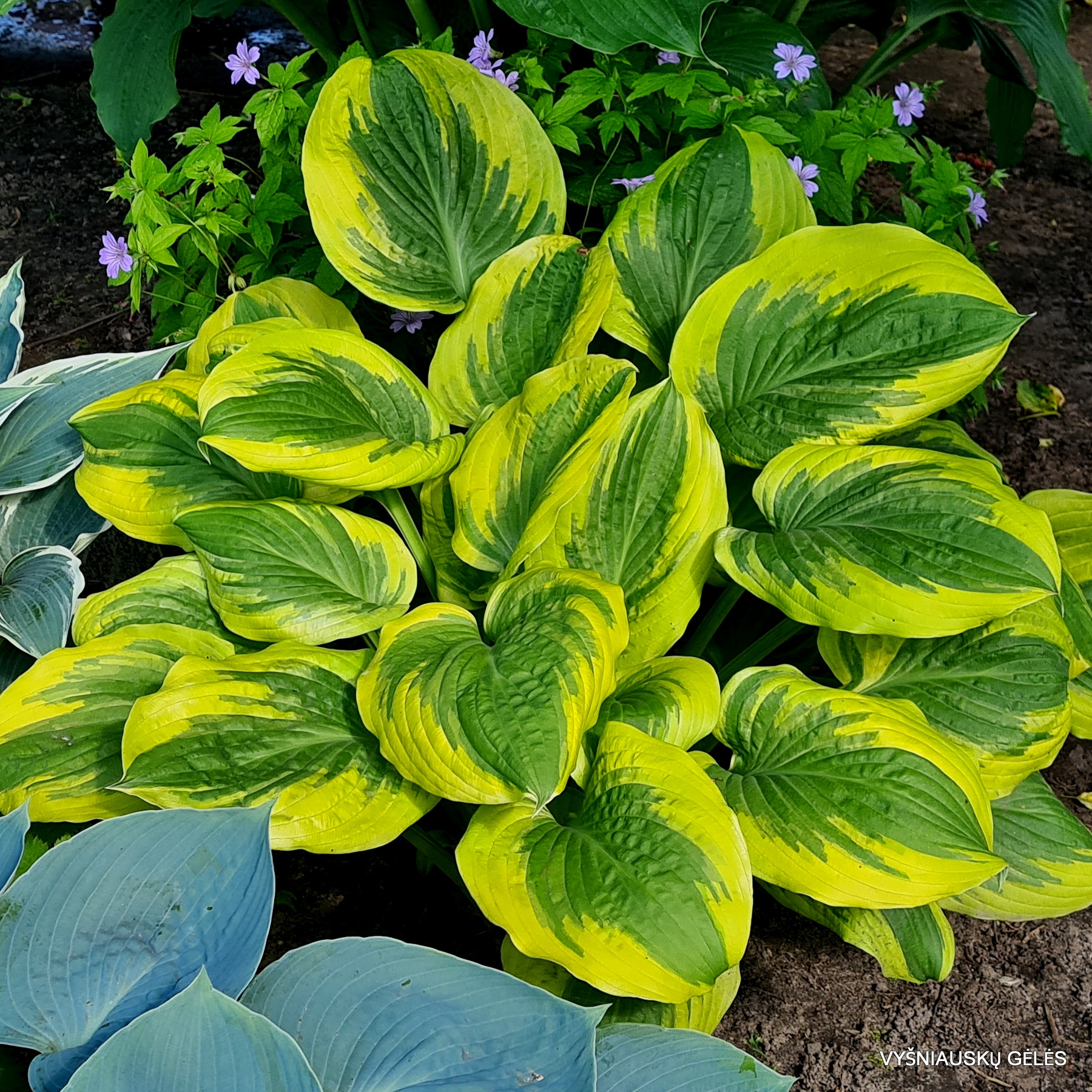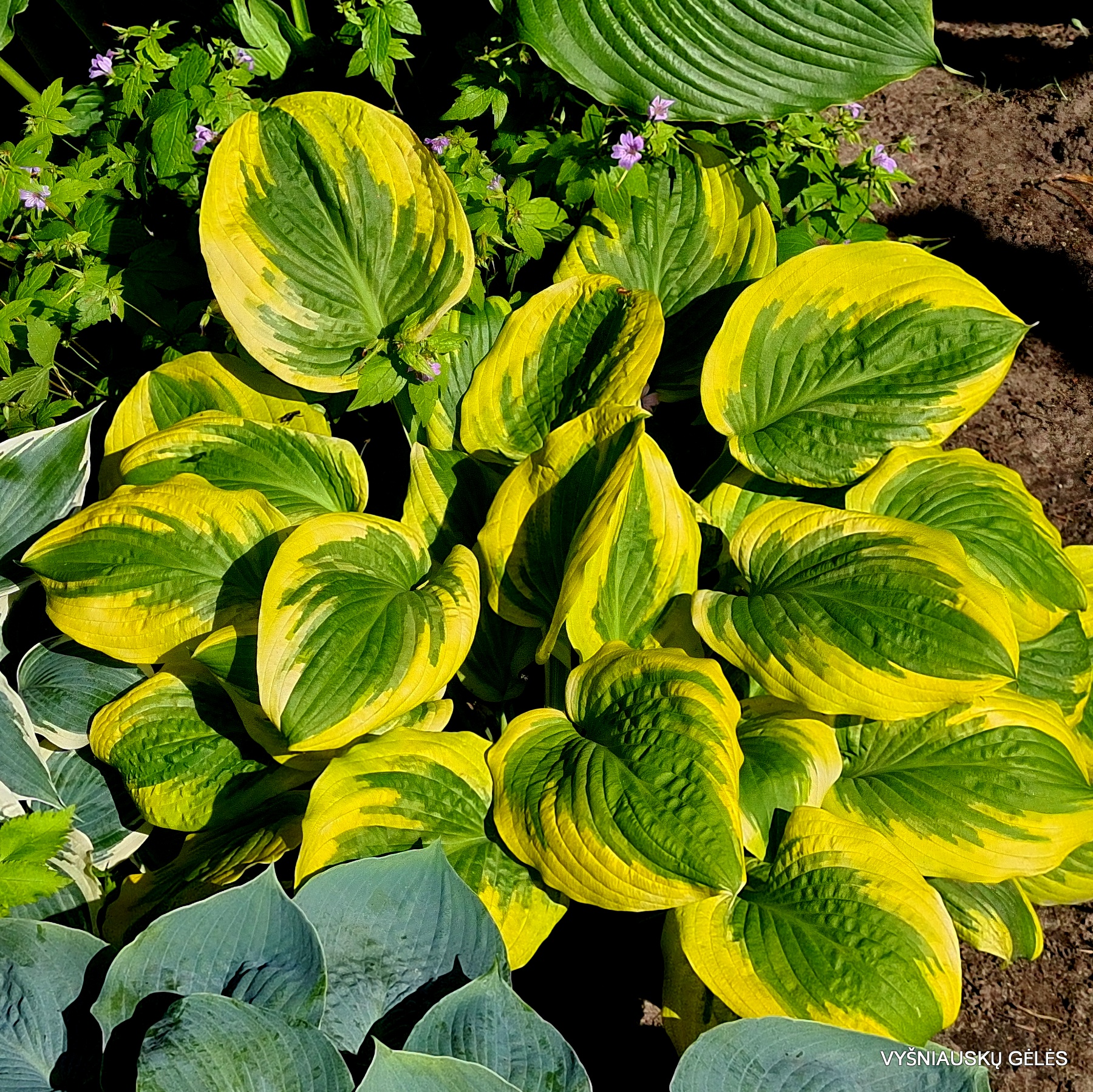 lapai standūs, pailgi, žali su neįprastu oranžiškai geltonu labai plačiu pakraščiu. Vidutinė. A – 30-40 cm