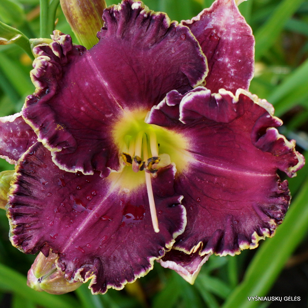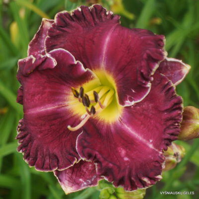 Žiedai vidutinio dydžio (15 cm skersmens), prisotintos purpurinės spalvos su melsva akimi ir garbanotais baltais pakraščiais. A – 70 cm