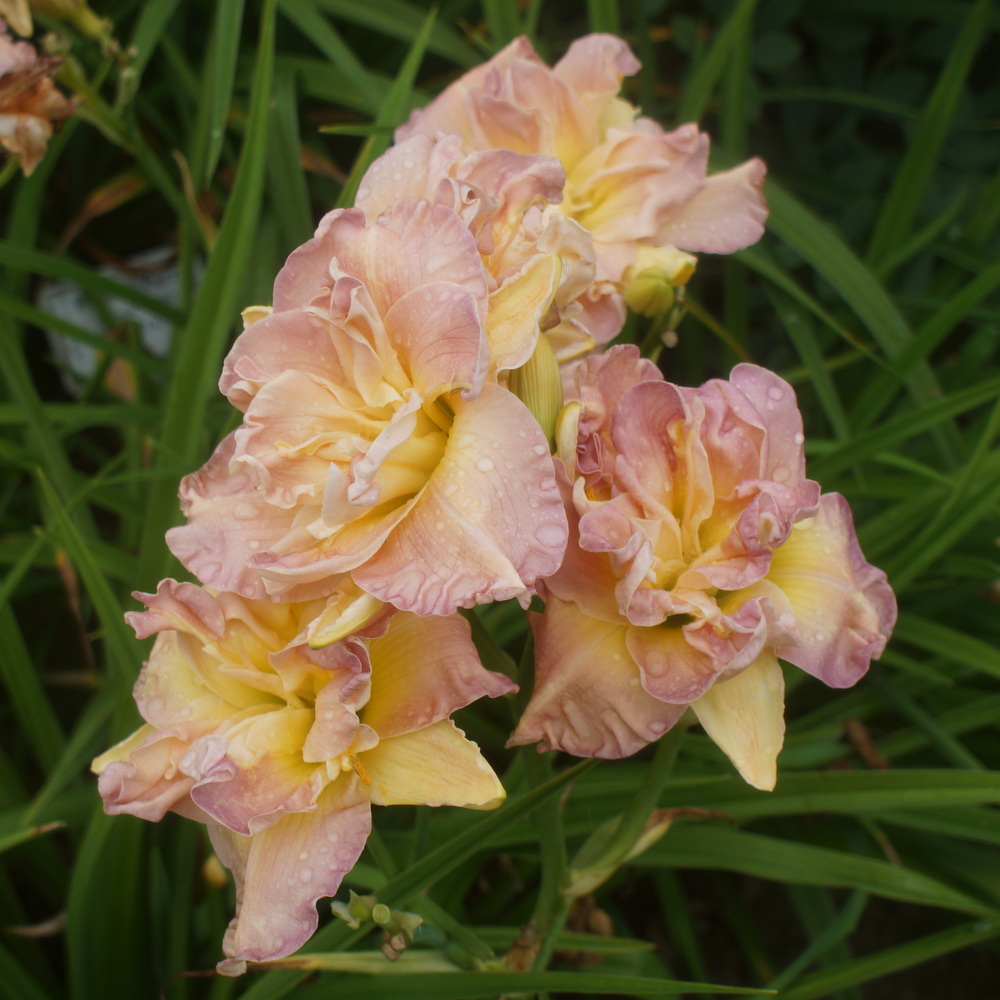Žiedai vidutinio dydžio (13,5 cm skersmens), pilnaviduriai, geltonų ir kreminių atspalvių. A – 80 cm