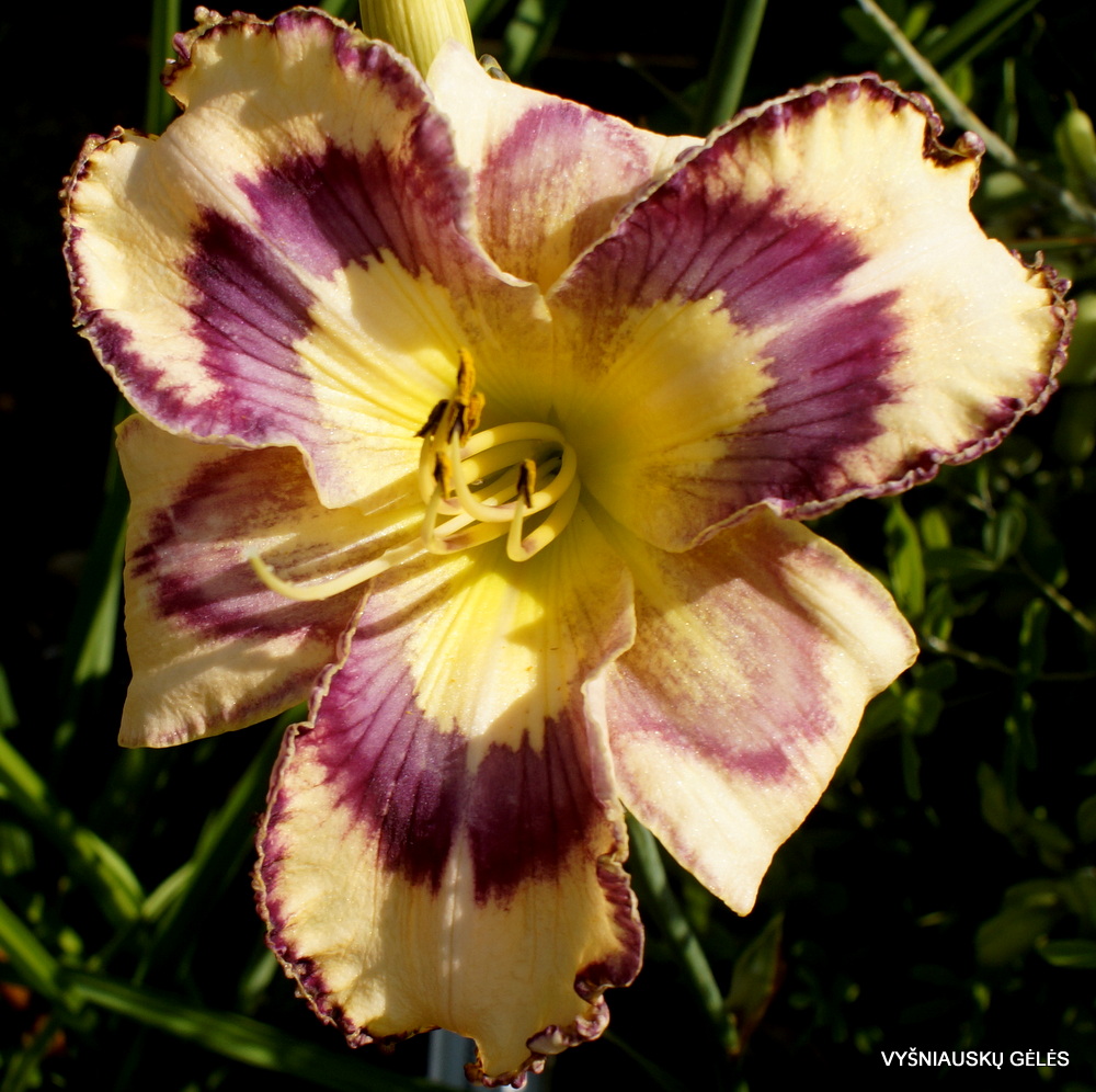 Žiedai vidutinio dydžio (16 cm skersmens) persikų spalvos su purpuriškai raudona akimi. A – 95 cm