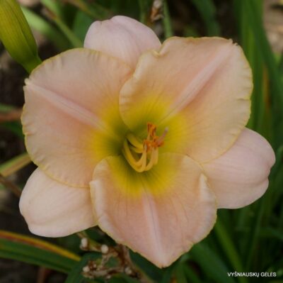 Žiedai vidutinio dydžio (13 cm skersmens) pasteliškai rožiniai su geltona aureole aplink žalią centrą. A – 70 cm