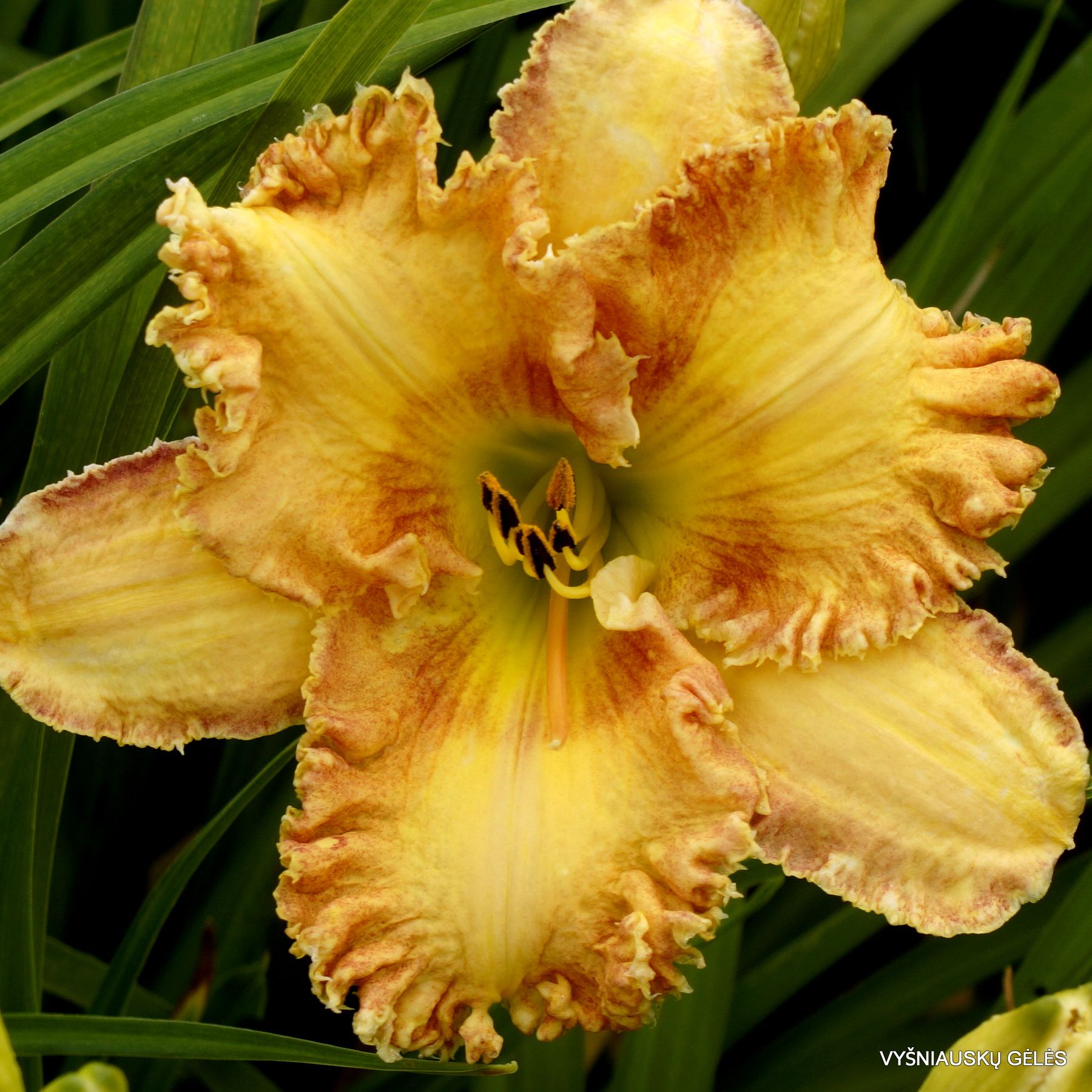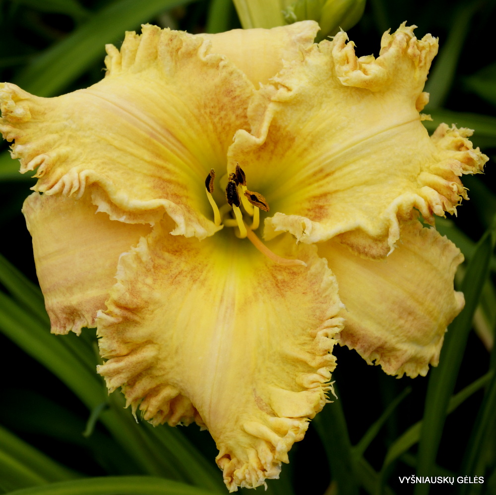 Žiedai 14 cm skersmens, persikiniai su labai plačiu gofruotu ir dantytu apvadu ir rusvu centru. Ant stiebo iki 25 pumpurų. A – 60 cm