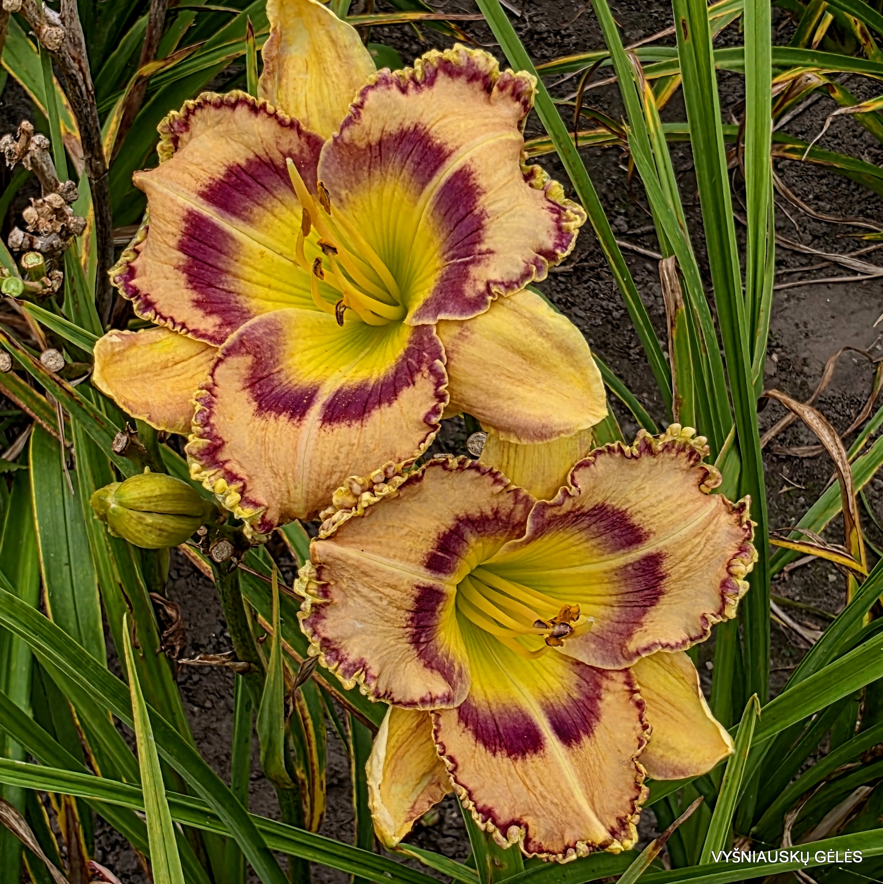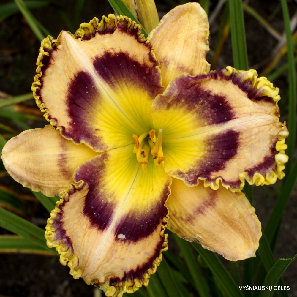 Žiedai vidutinio dydžio (15 cm skersmens) švelniai rožiniai su raudonai violetine akimi ir apvadu. A – 50 cm