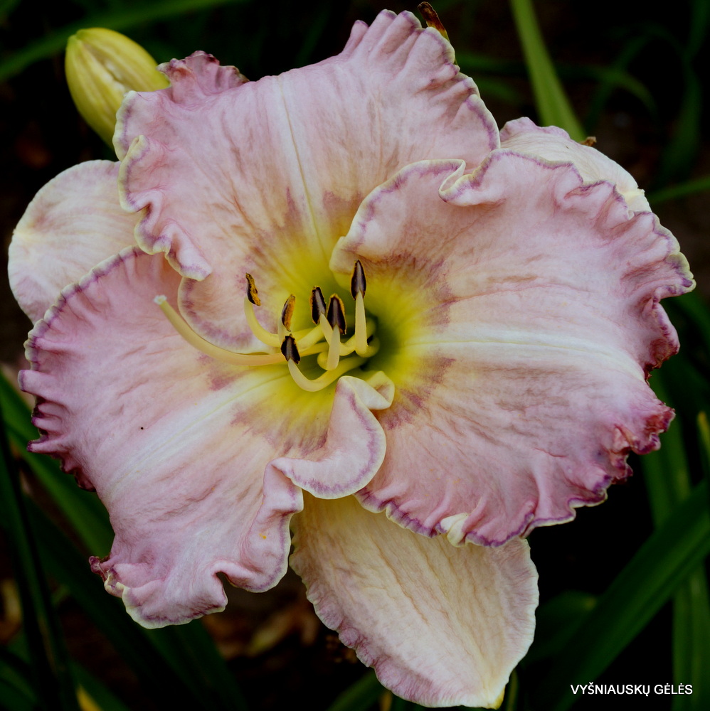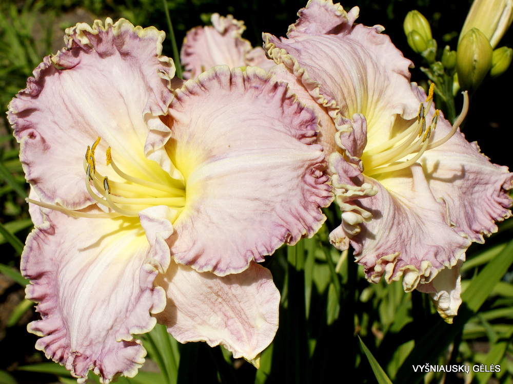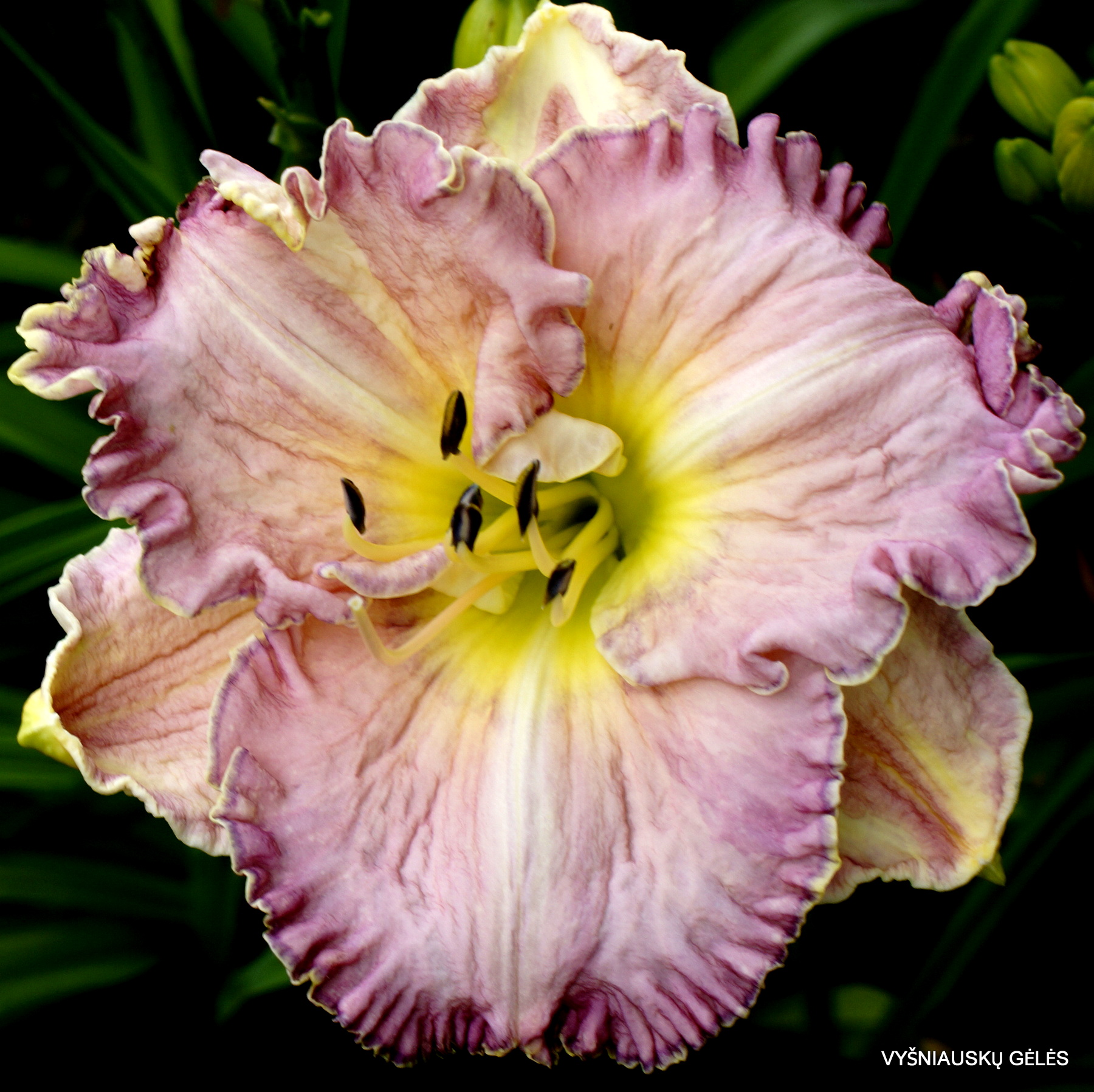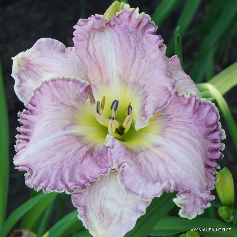Žiedai vidutinio dydžio (16,5 cm skersmens), levandiškai rožiniai su ryškesne levandine akimi, žaliu centru ir dvigubos spalvos garbanotu apvadu. A – 55 cm