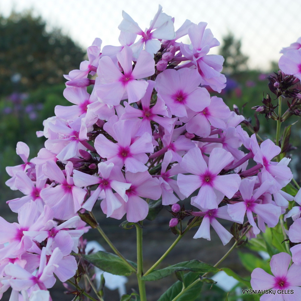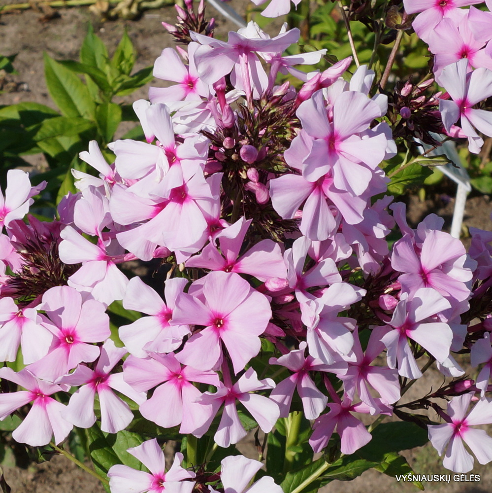 Žiedai dideli, šviesiai rožiniai su purpurine akute.