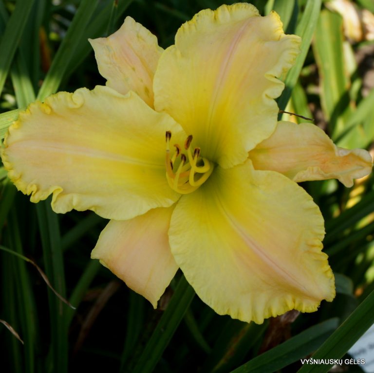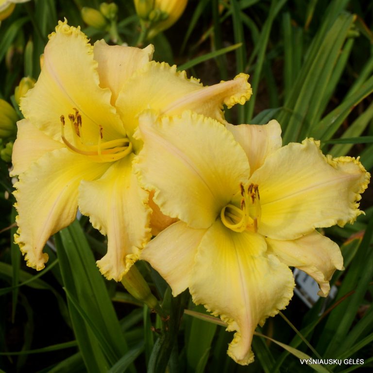 Žiedai nemaži (17 cm skersmens) geltonai kreminiai su rožiniu atspalviu. A – 100 cm