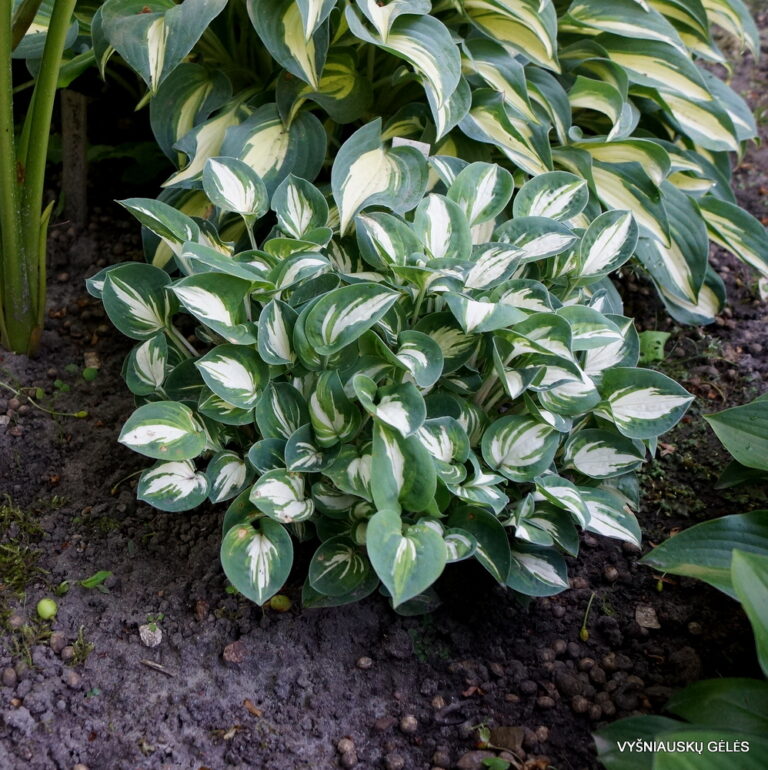 lapai nedideli, pilkšvai žali su dideliu baltu centru. Miniatiūrinė. A – 15 cm