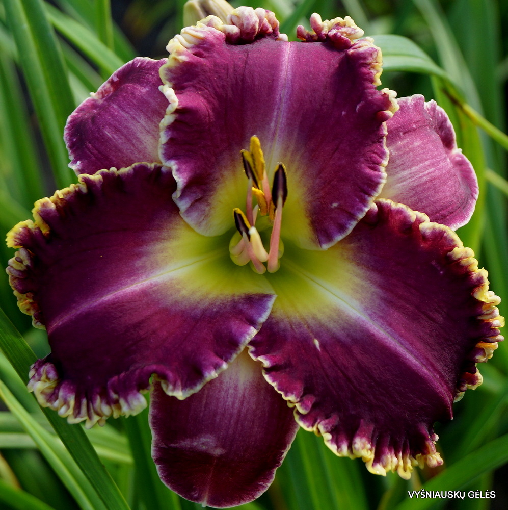 Žiedai vidutinio dydžio (14 cm skersmens), purpuriniai su geltonu, garbanotu ir spygliuotu apvadu. Pradeda žydėti vėliau už daugumą veislių ir žydi iki šalčių. A – 65 cm