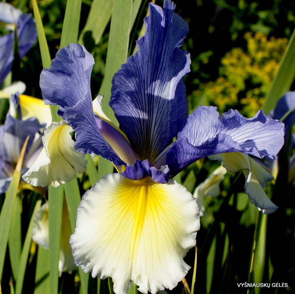 Viršutiniai vainiklapiai alyviškai mėlyni, apatiniai  – kremiškai balti su geltona dėme ir šviesiai melsvu apvadu. A – 110 – 120 cm