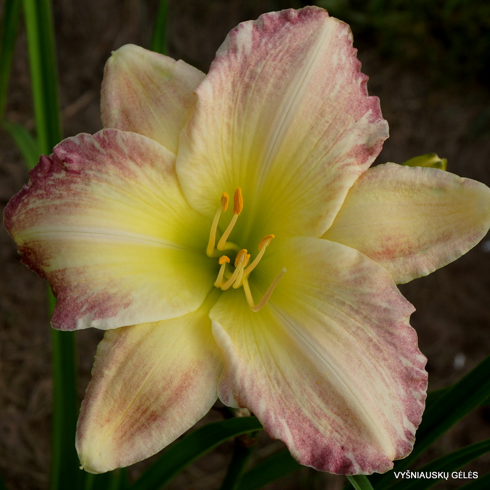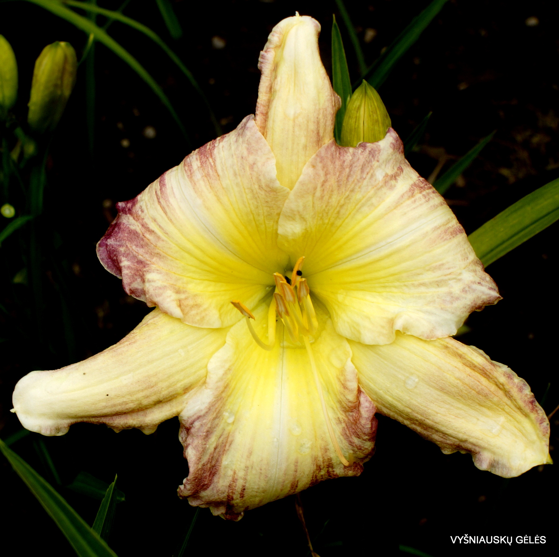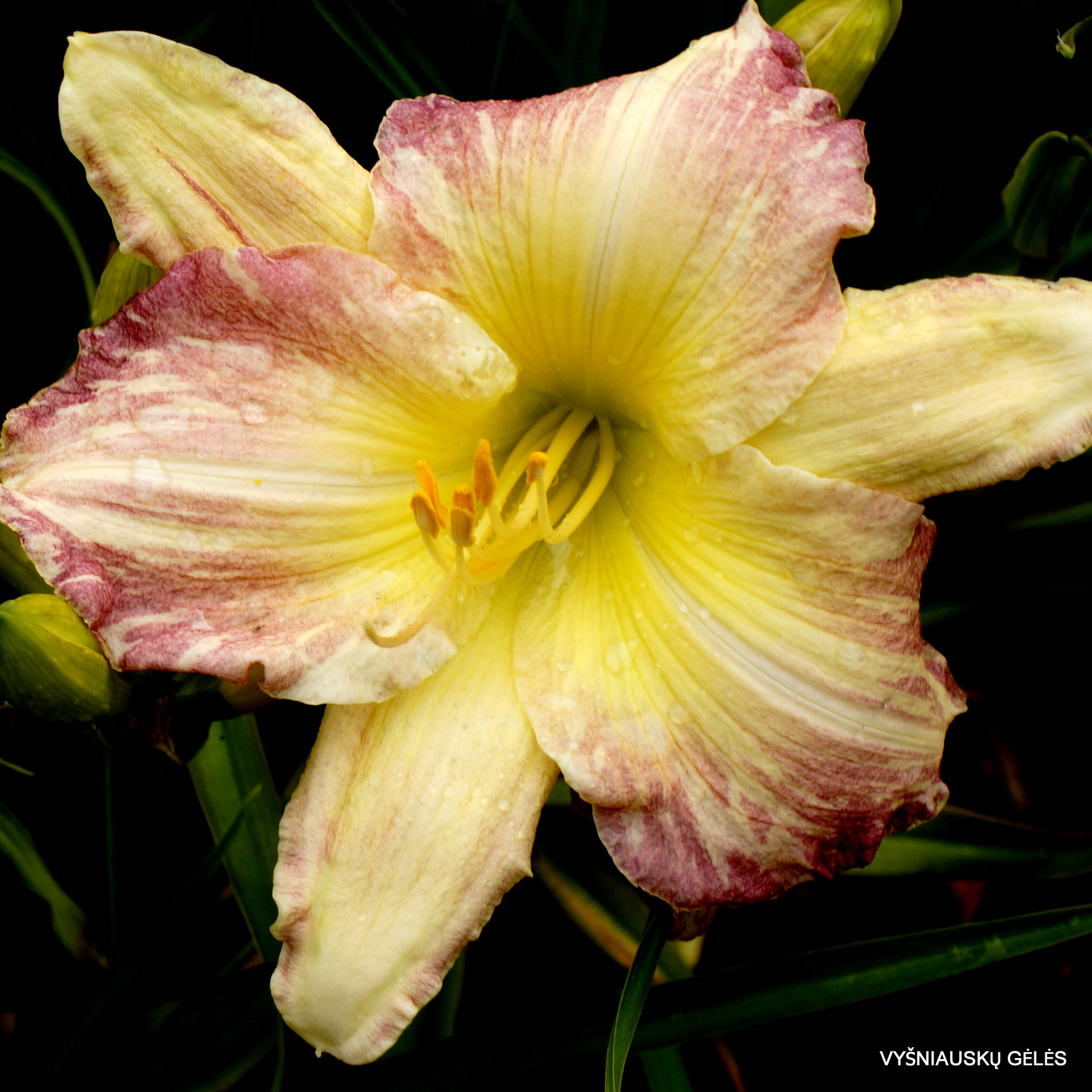Žiedai vidutinio dydžio (13 cm skersmens) kreminiai su alyviškai rožinėmis juostomis. A – 55 cm
