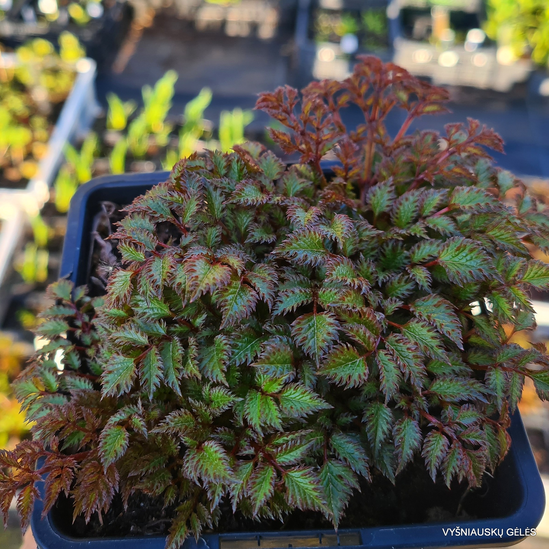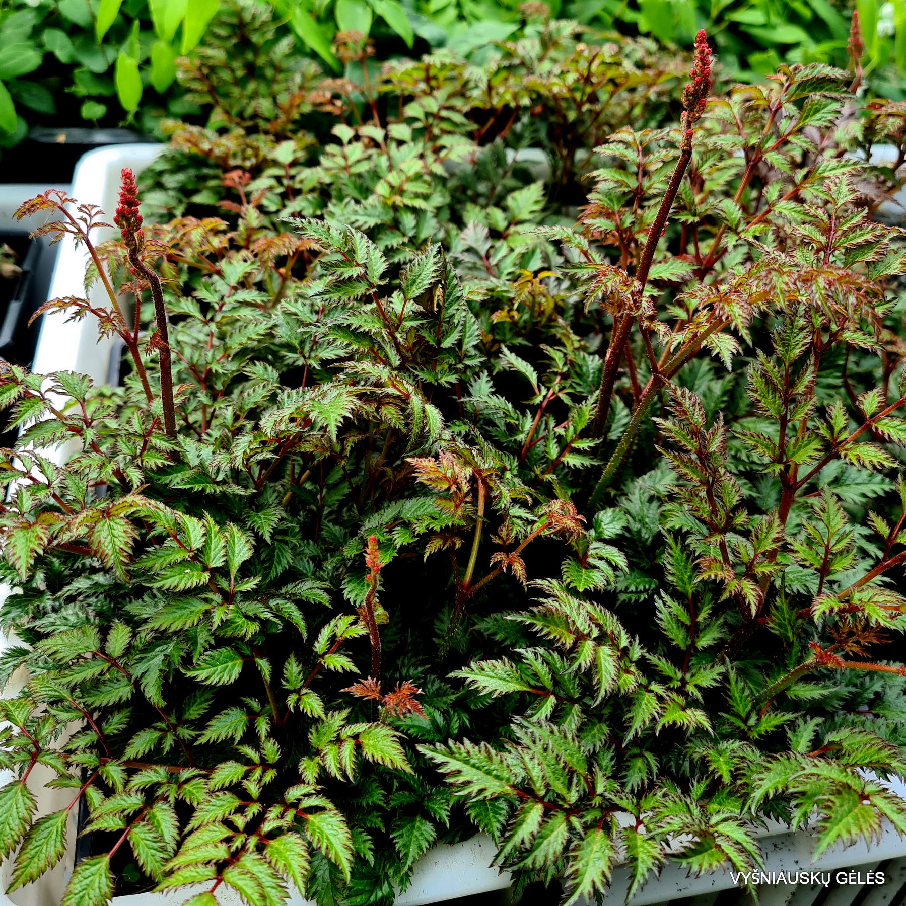 Žema astilbė rožiniais žiedynais ir puošniais stipriai karpytais žaliais lapeliais. A – 30 cm.