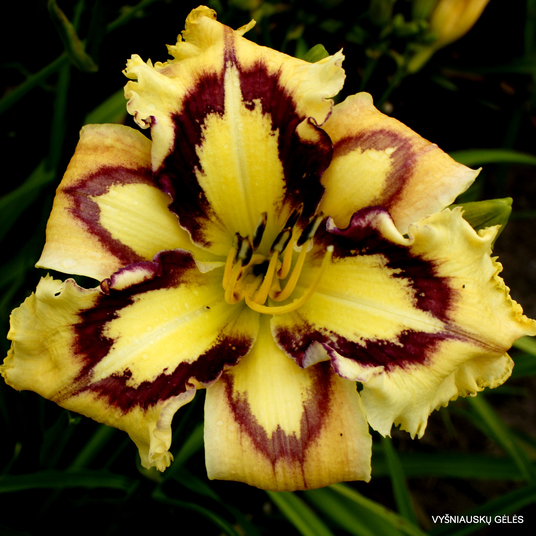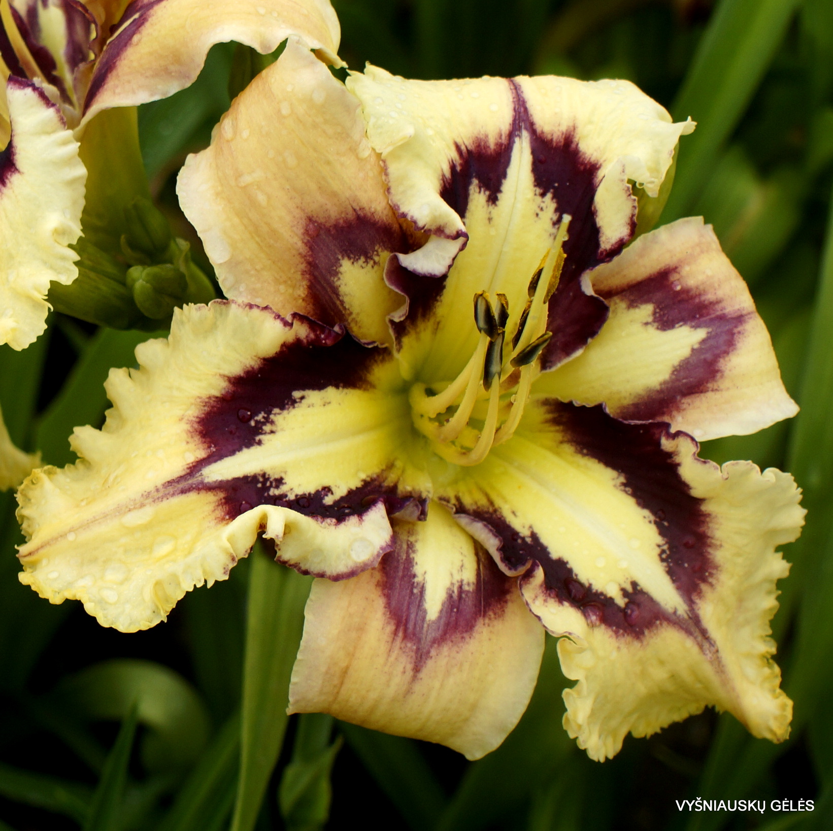 Žiedai vidutinio dydžio (15 cm skersmens) gelsvai kreminiai su purpurine dėme. A – 75 cm