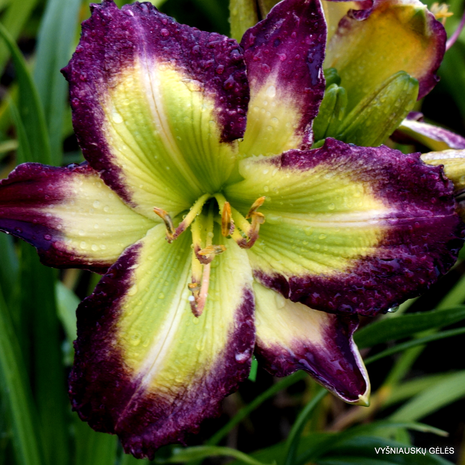 Žiedai dideli (19 cm skersmens) tamsiai purpuriniai su dideliu žaliu centru. A – 75 cm