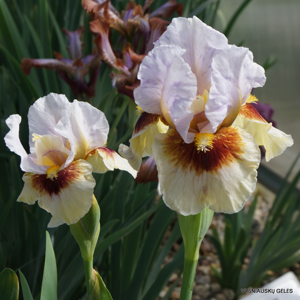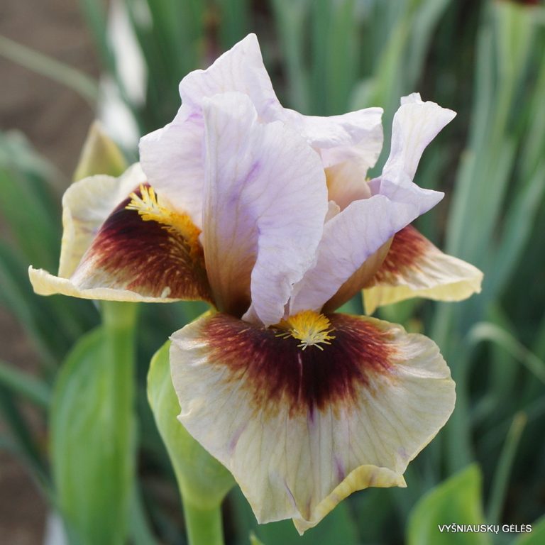 Viršutiniai vainiklapiai melsvi, apatiniai – kreminiai su ruda dėme. A – 60 cm