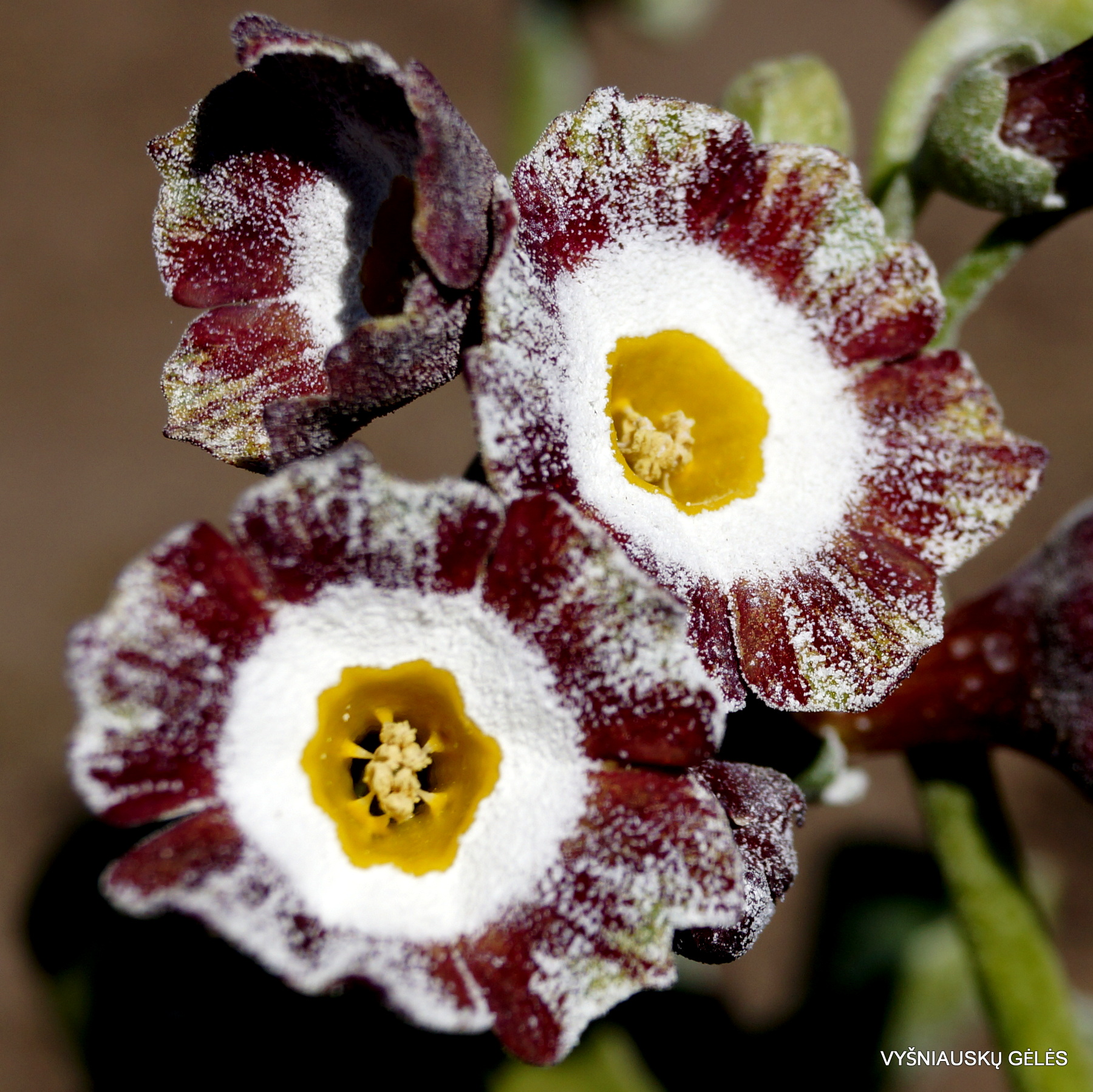 žiedai žali su rusvai raudonomis juostomis ir baltu centru.