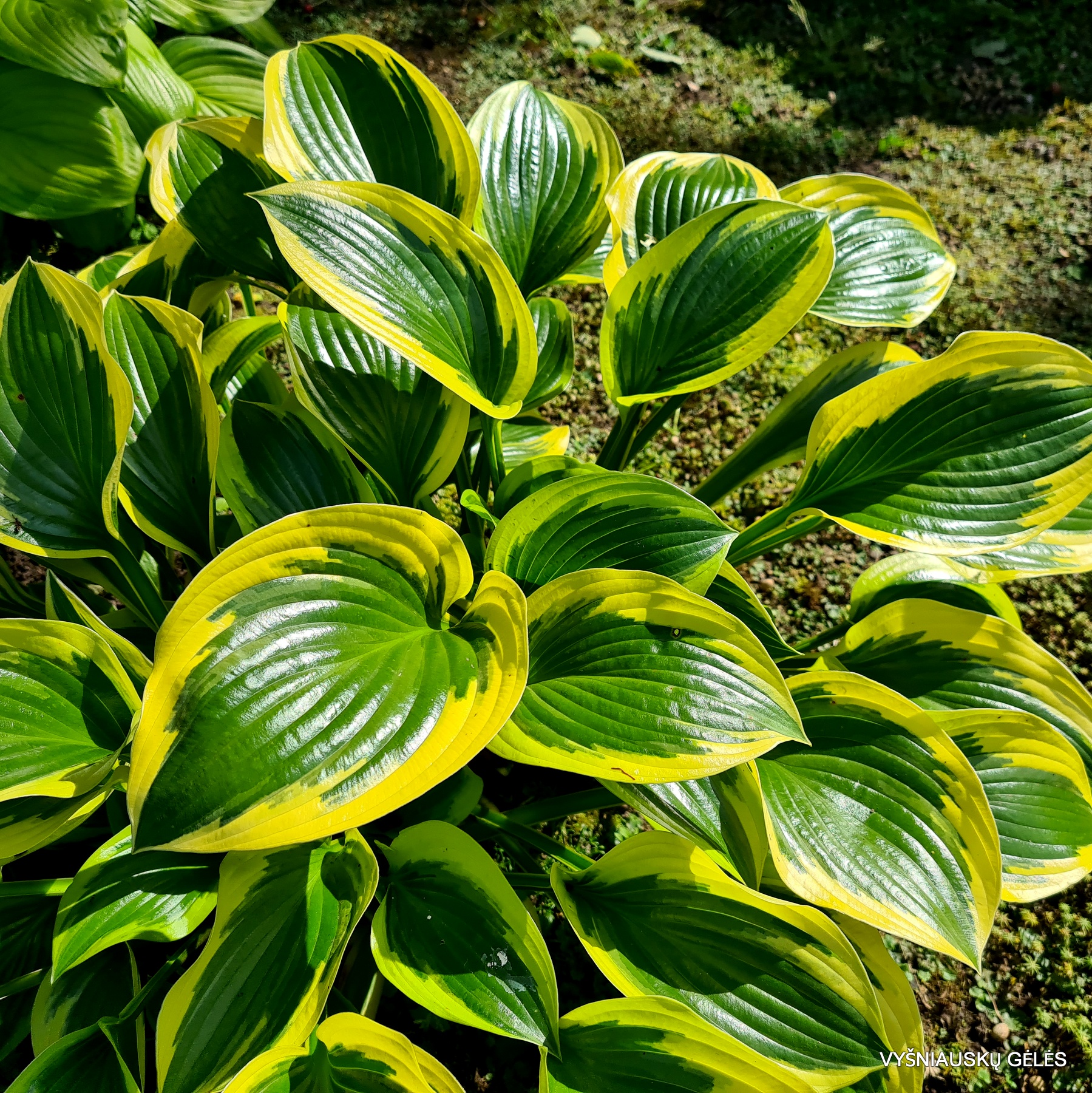 lapai labai blizgantys, tamsiai žali su kremiškai geltonu apvadu. A – 25-30 cm