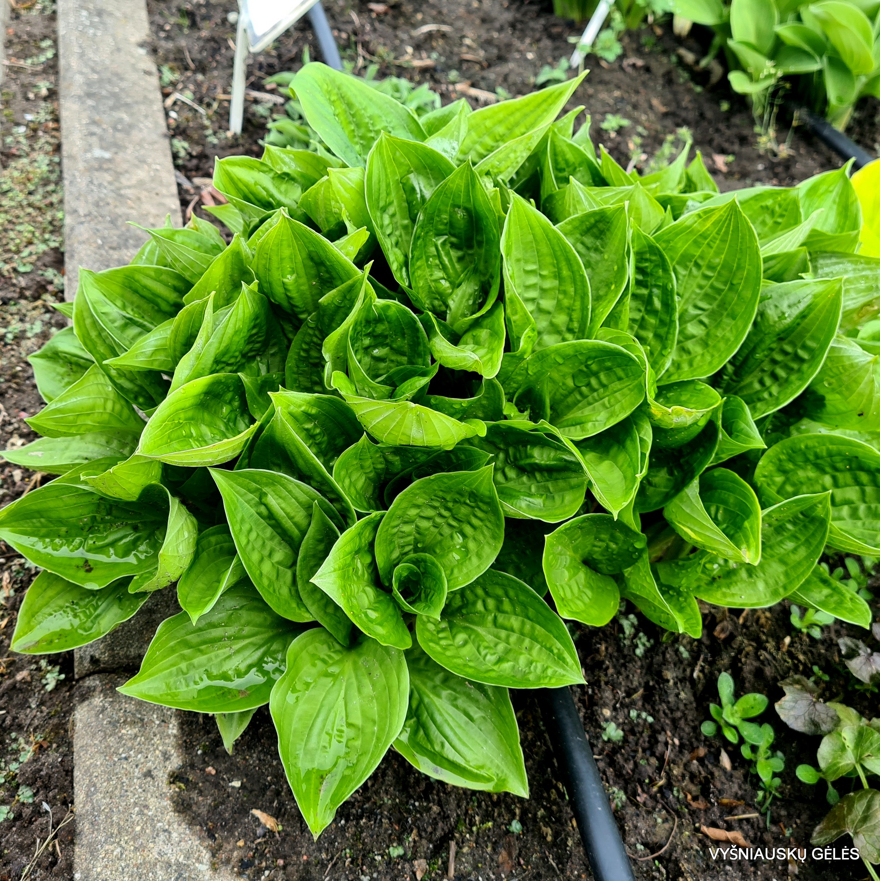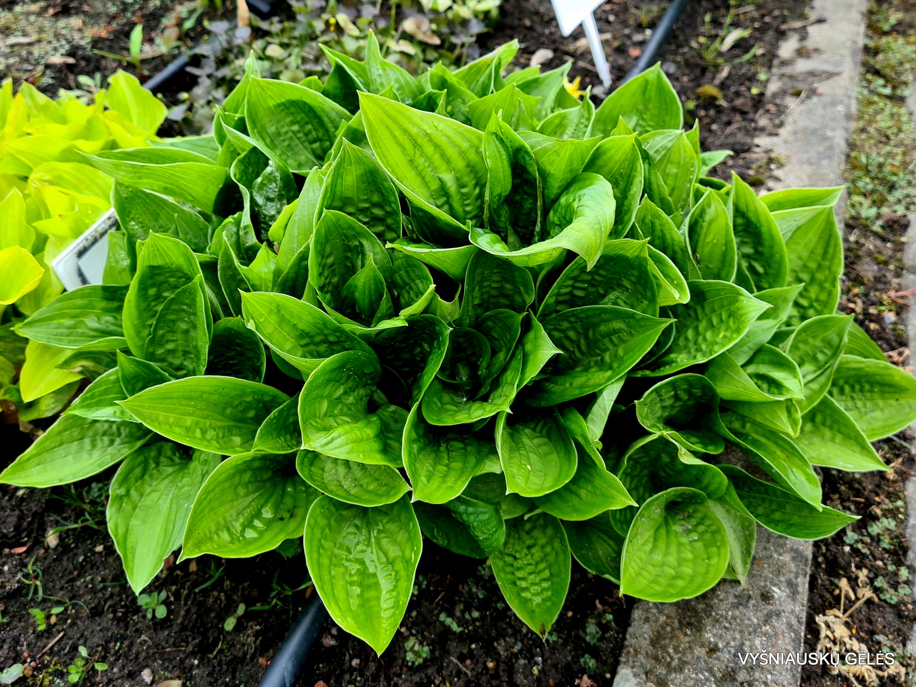Lapai ovalūs, tamsiai žali, gofruoti. Galima auginti saulėje. A – 20 cm