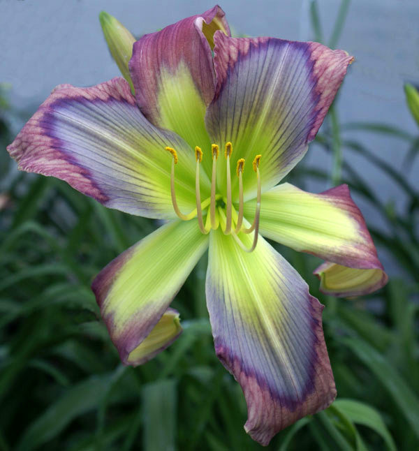 Žiedai labai dideli (24 cm skersmens), purpuriškai rožiniai su melsva dėme ir žaliu centru. A – 95 cm