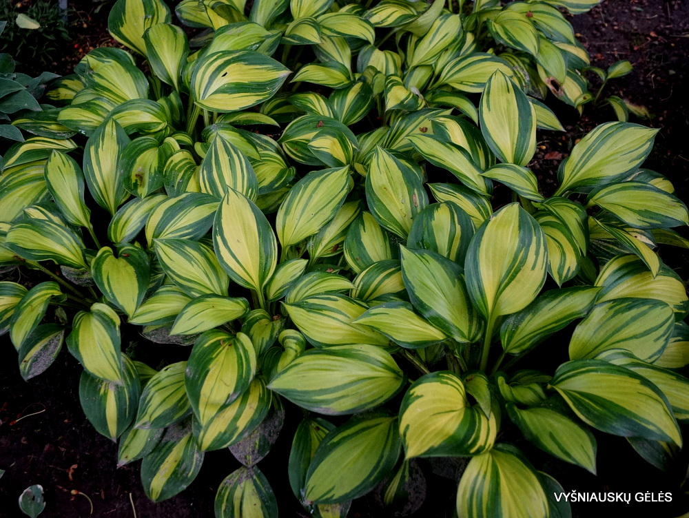 lapai standūs, pailgi, blizgantys, geltoni su labai netaisyklingu tamsiai žaliu apvadu. Žiedstiebiai purpuriniai. Žiedai alyviniai.  Vidutinė. A – 20-25 cm