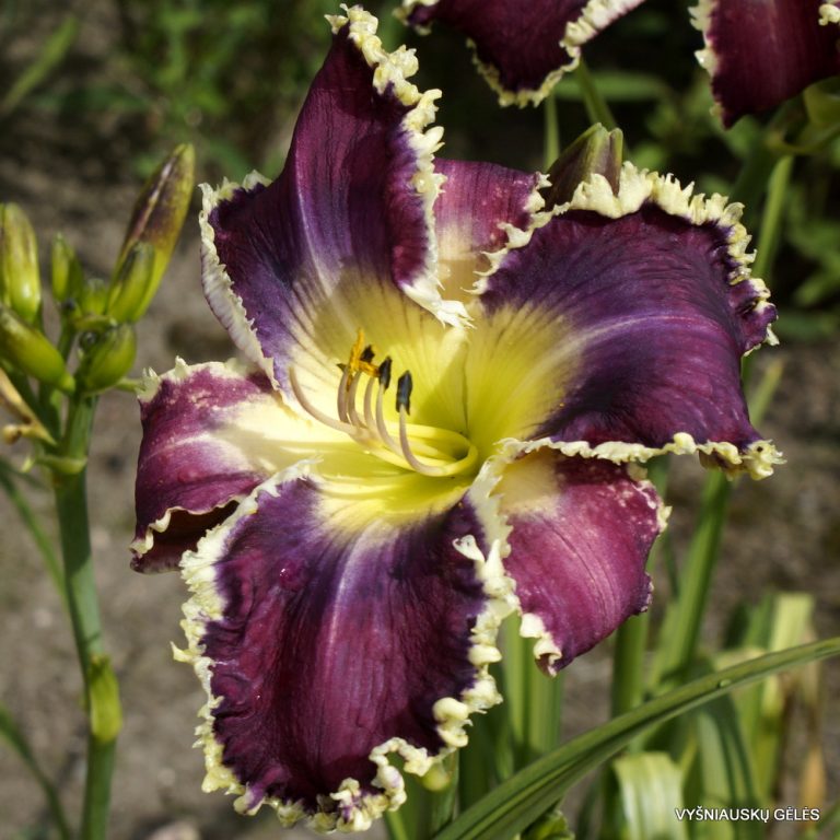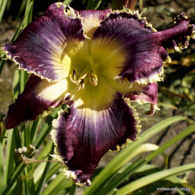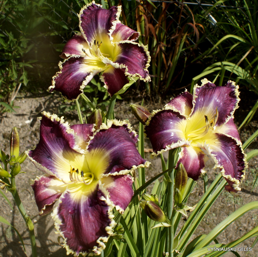 Žiedai 16 cm skersmens levandiškai purpuriniai su mėlyna akimi,geltonu centru ir baltu garbanotu ir dantytu pakraščiu.