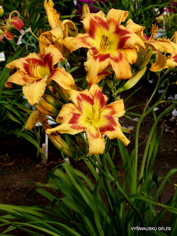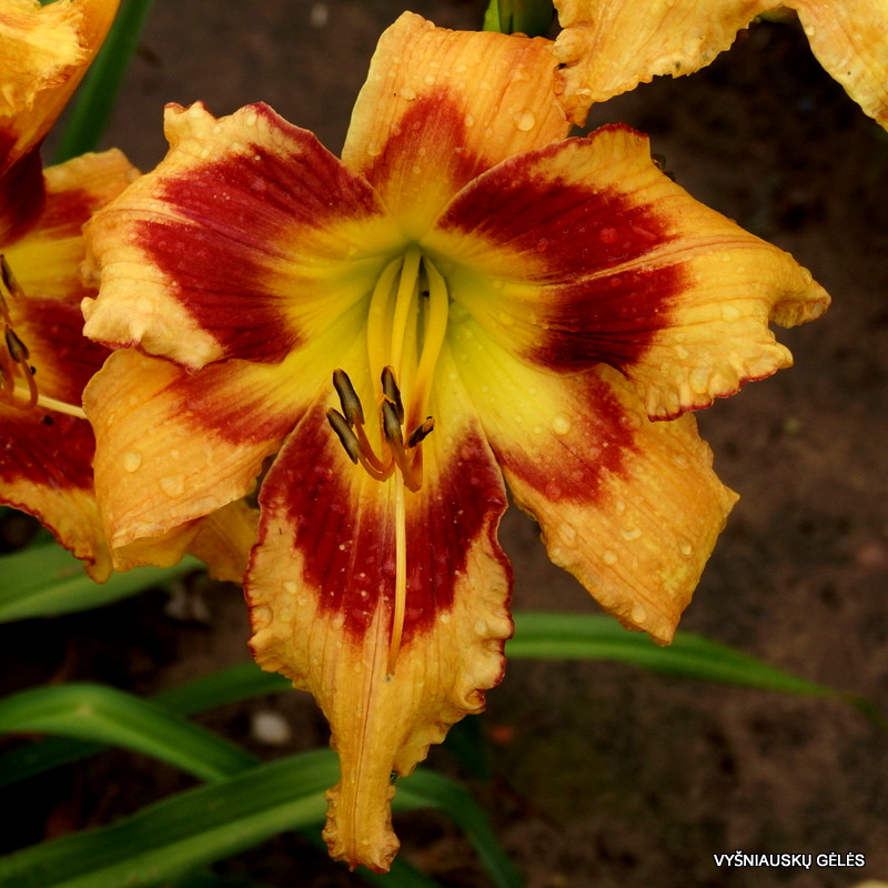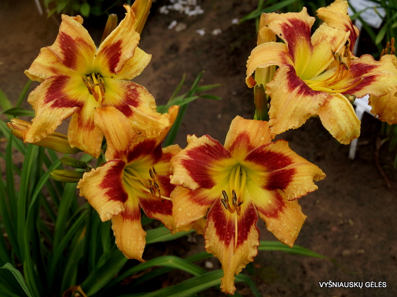 Žiedai dideli (20,5 cm skersmens), persikiniai su didele, trikampe, raudonai kaštonine dėme. Gausiai žydinti viendienė. A – 100 cm