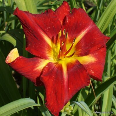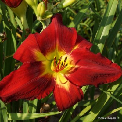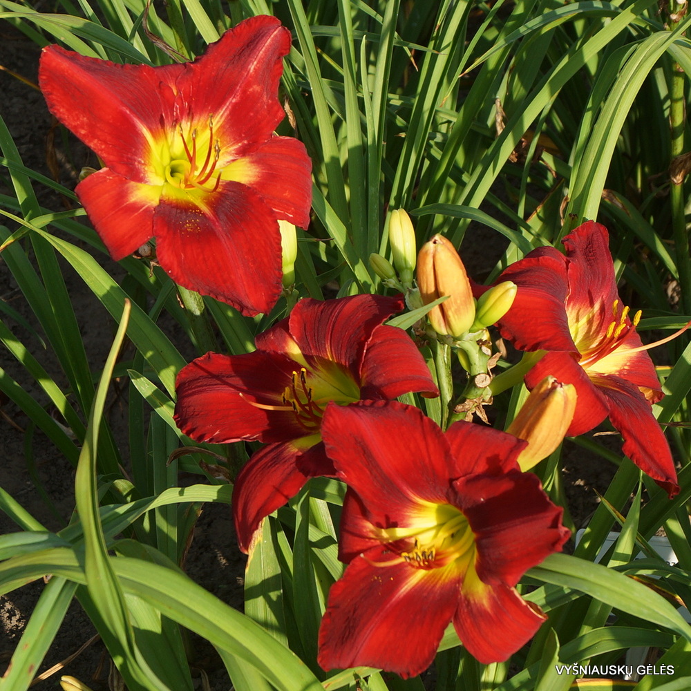 Žiedai dideli (18 cm skersmens) ryškiai raudoni. A – 75 cm