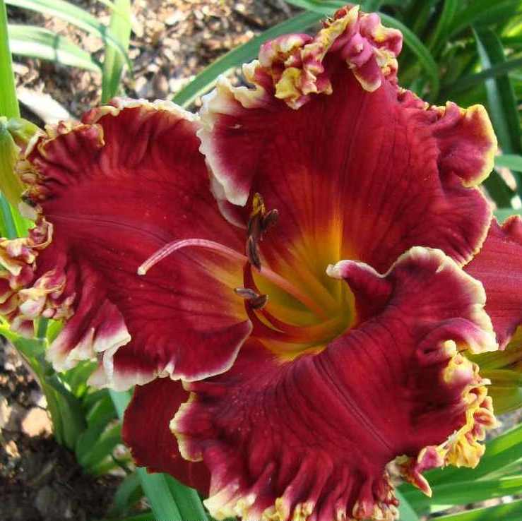 Žiedai vidutinio dydžio (15 cm skersmens) ryškiai raudoni su garbanotu beveik baltu apvadu. A – 100 cm