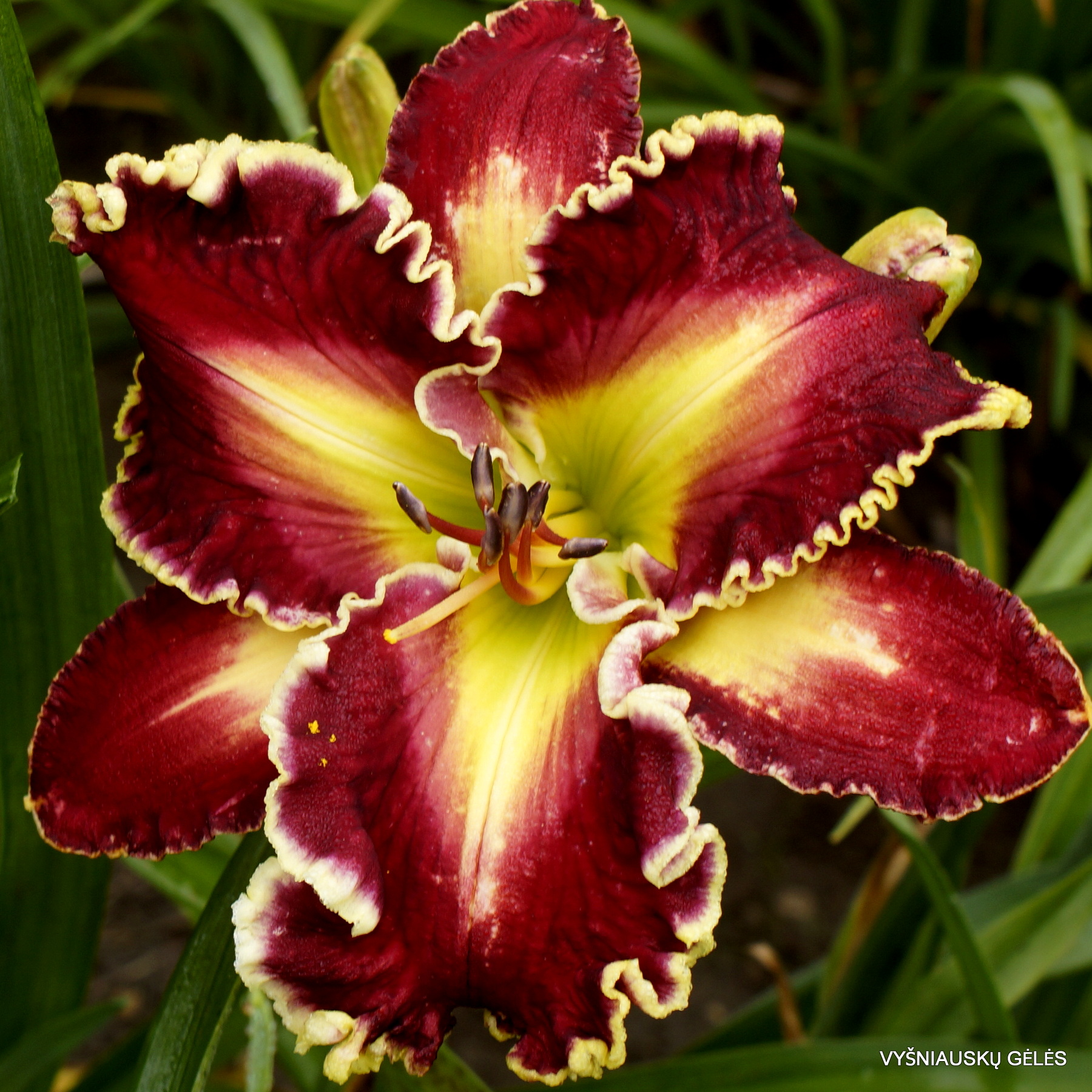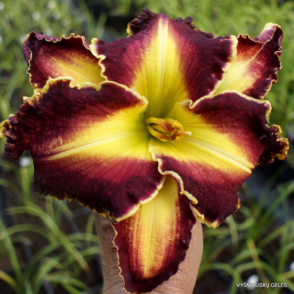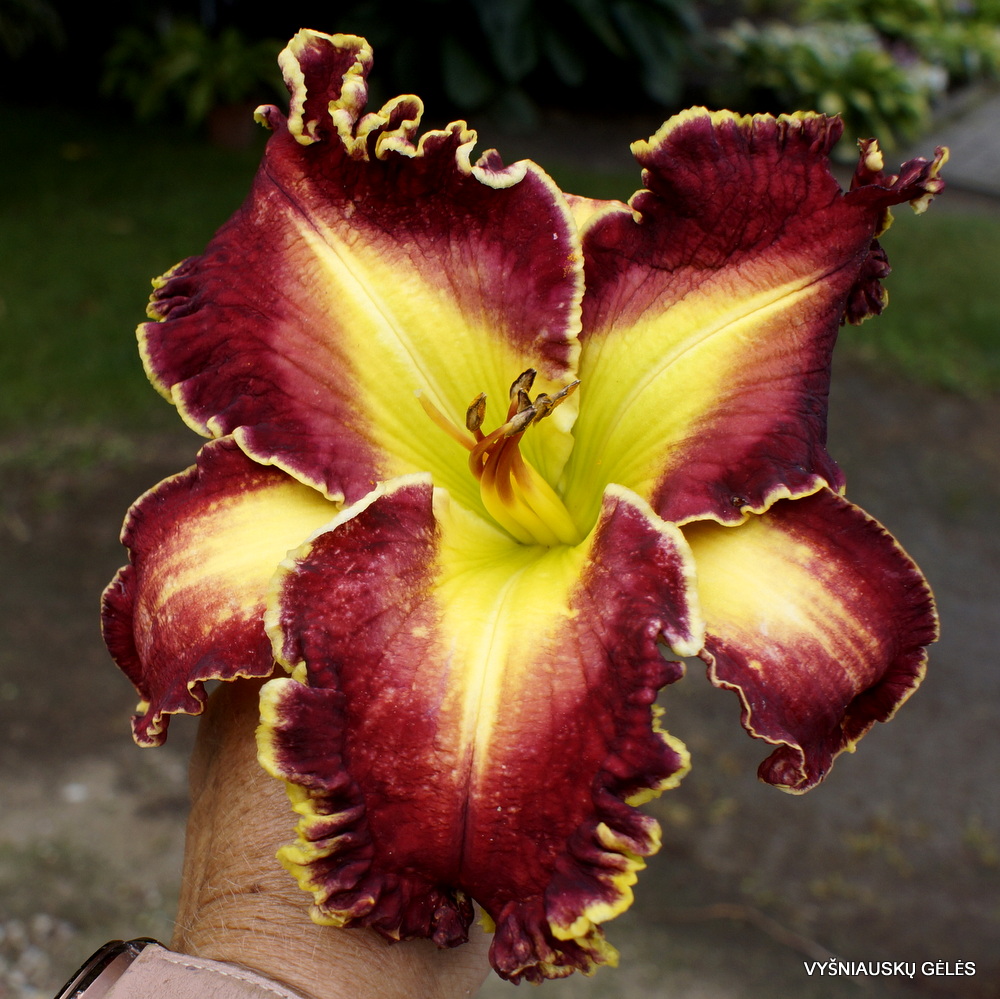 Žiedai dideli (20 cm skersmens) tamsiai raudoni su su labai dideliu žalsvai geltonu trikampiu centru. A – 90 cm