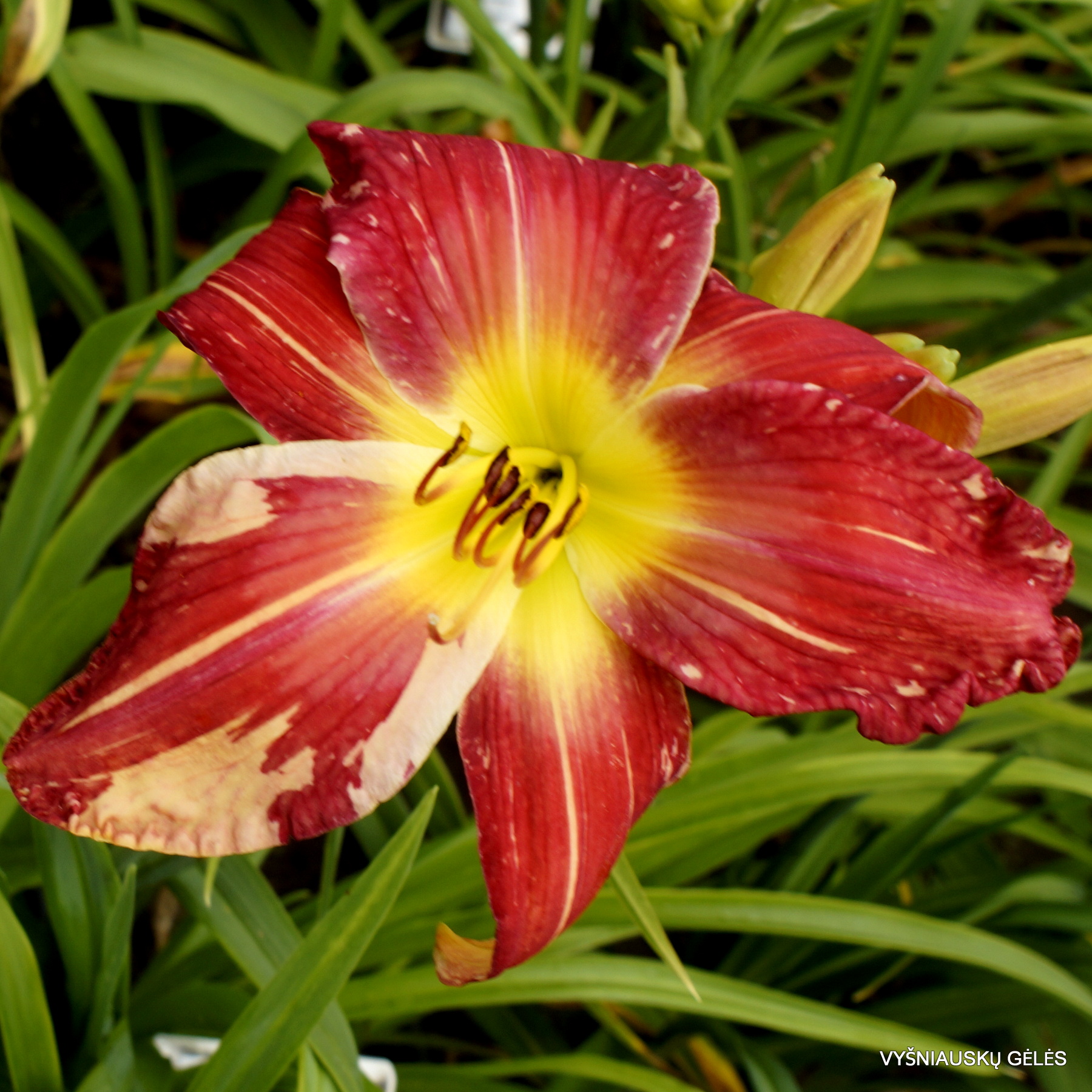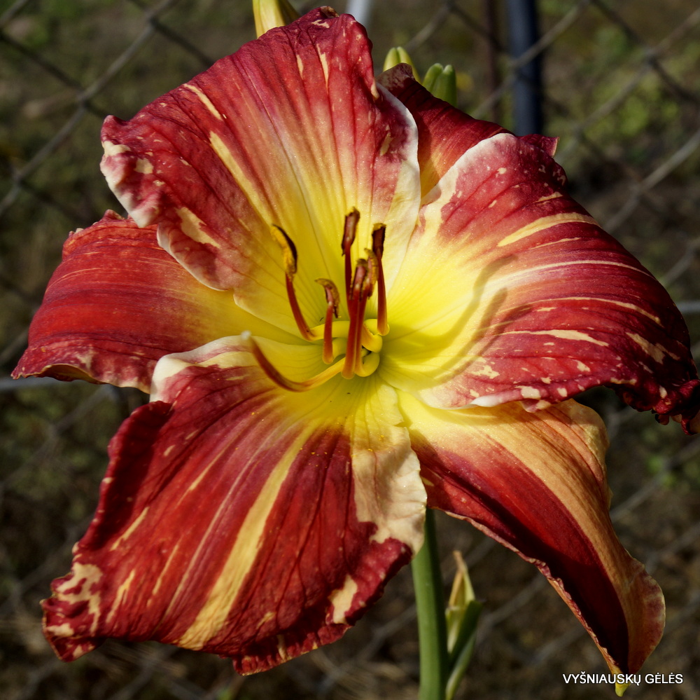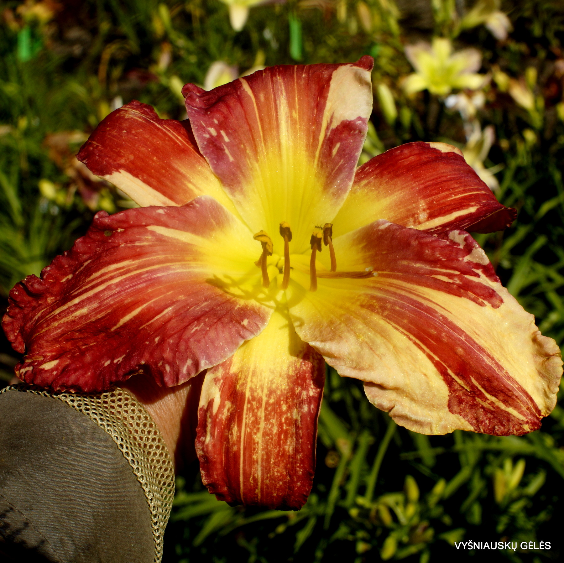 Žiedai dideli (20 cm skersmens) rožiškai raudoni su kreminėmis dėmėmis. A – 90 cm