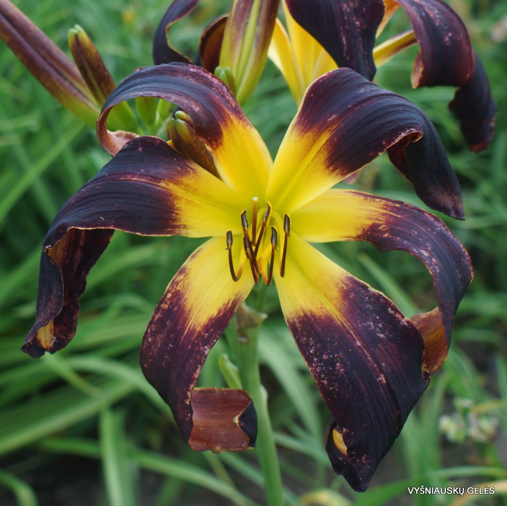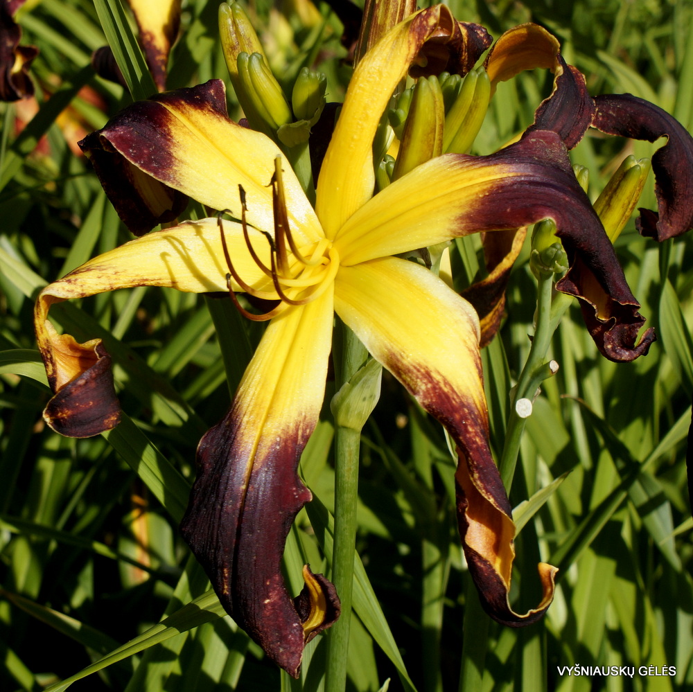 Žiedai labai stambūs (26 cm skersmens), juosvai raudoni su dideliu geltonu centru. A – 95 cm
