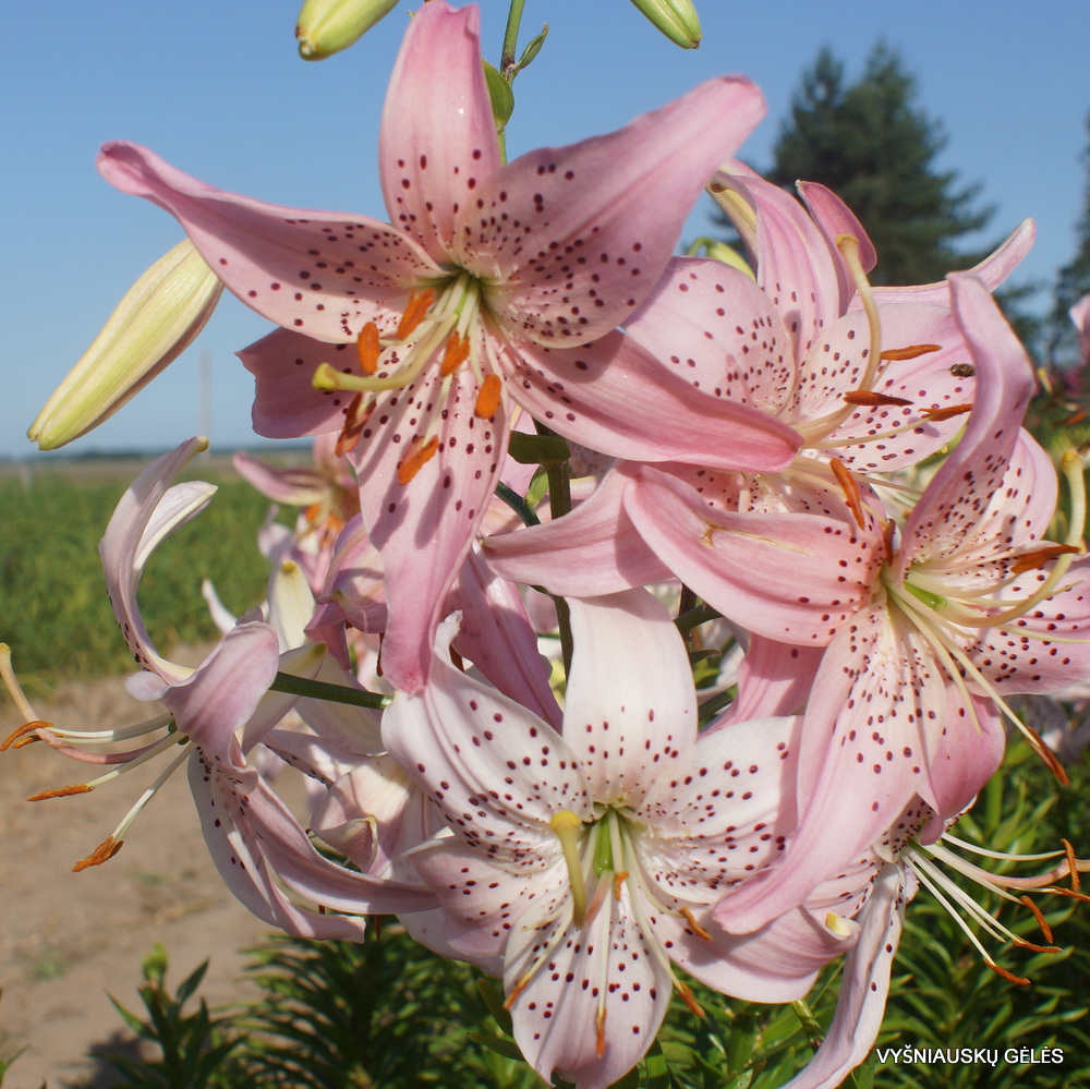 Žiedai nukreipti į šonus ir į apačią šviesiai rožiniai taškuoti. Aukšta. A – 100-120 cm