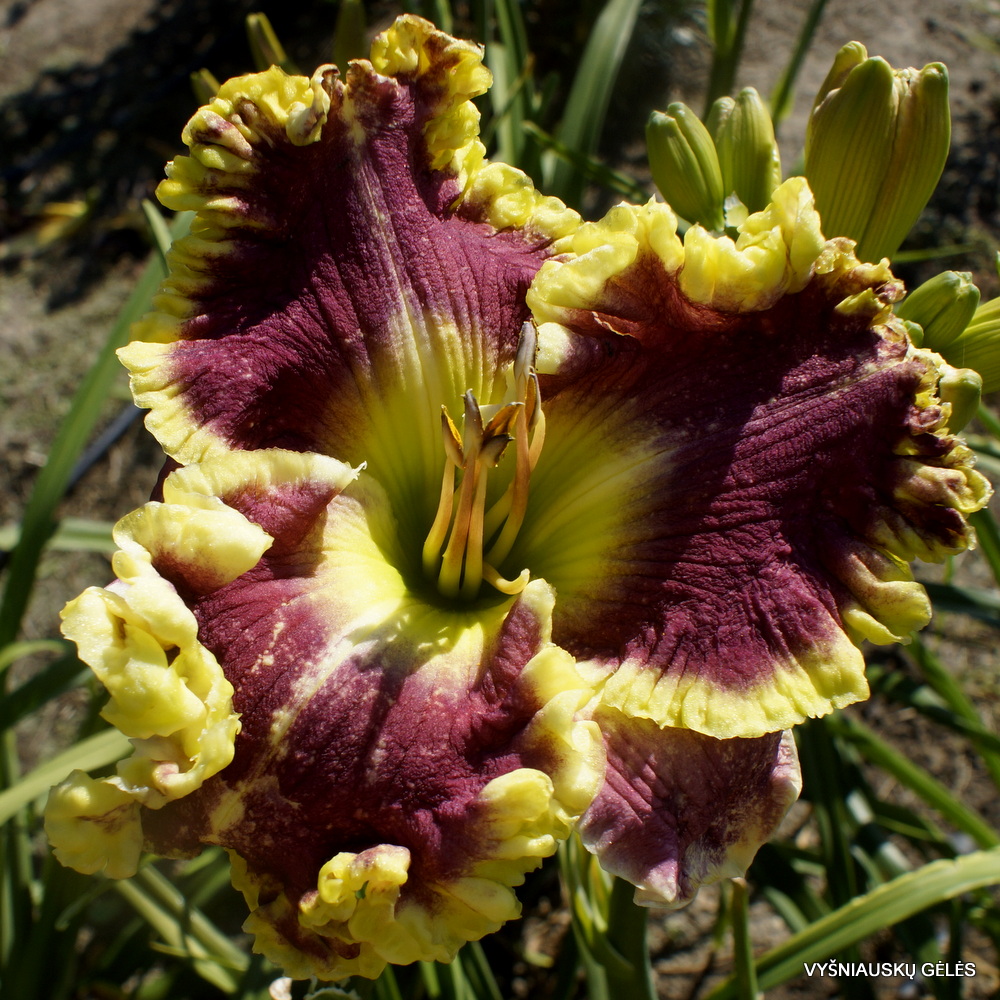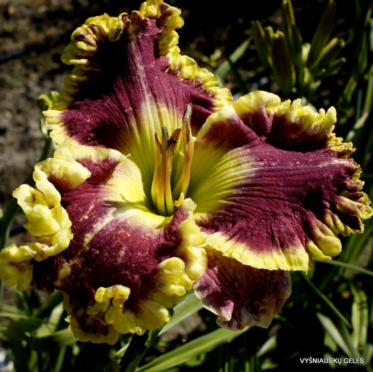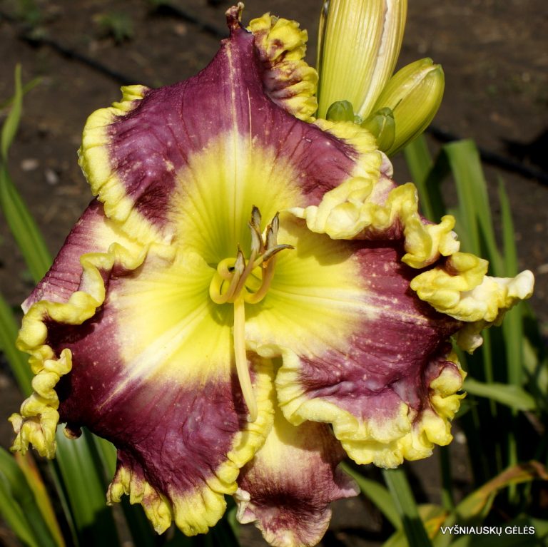 Žiedai dideli (19 cm skersmens) purpuriniai su gelsvai žaliu centru ir apvadu. A – 85 cm