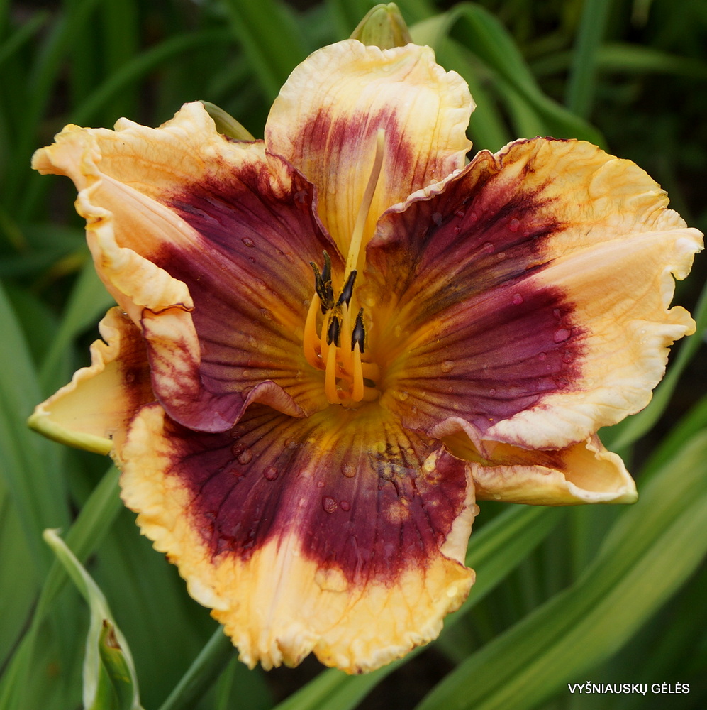 Žiedai vidutinio dydžio (14 cm skersmens) kreminiai su didele kaštonine dėme. A – 65 cm