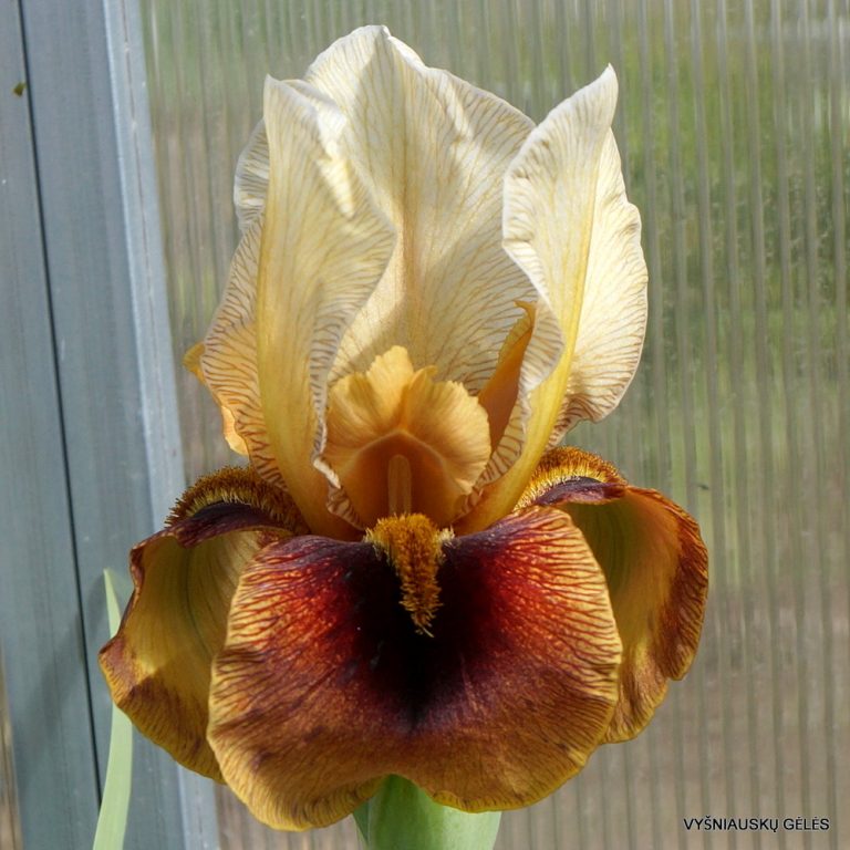 Viršutiniai vainiklapiai kreminiai su tamsesnėmis gyslomis, apatiniai – geltoni su beveik juoda dėme ir rausvomis gyslomis. A – 50-55 cm