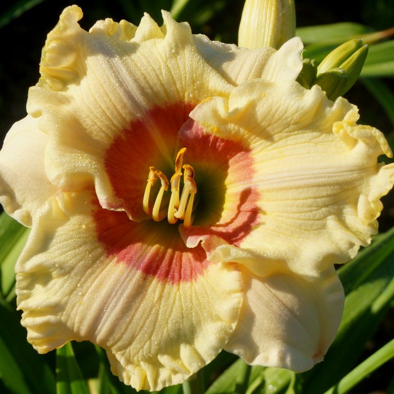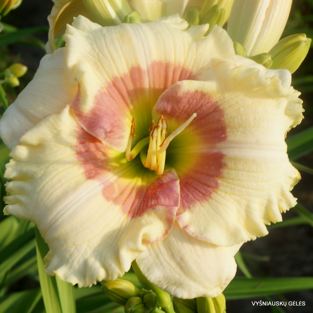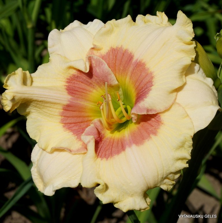 Žiedai vidutinio dydžio (15 cm skersmens) kreminiai su rožine akimi. A – 90 cm