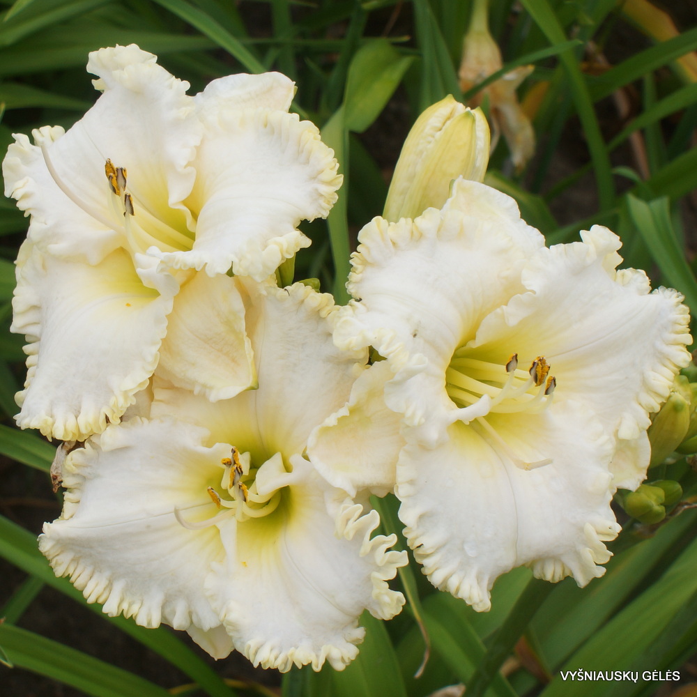 Žiedai vidutinio dydžio (14 cm skersmens), balti su garbanotu pakraščiu ir žaliu centru. A – 75 cm