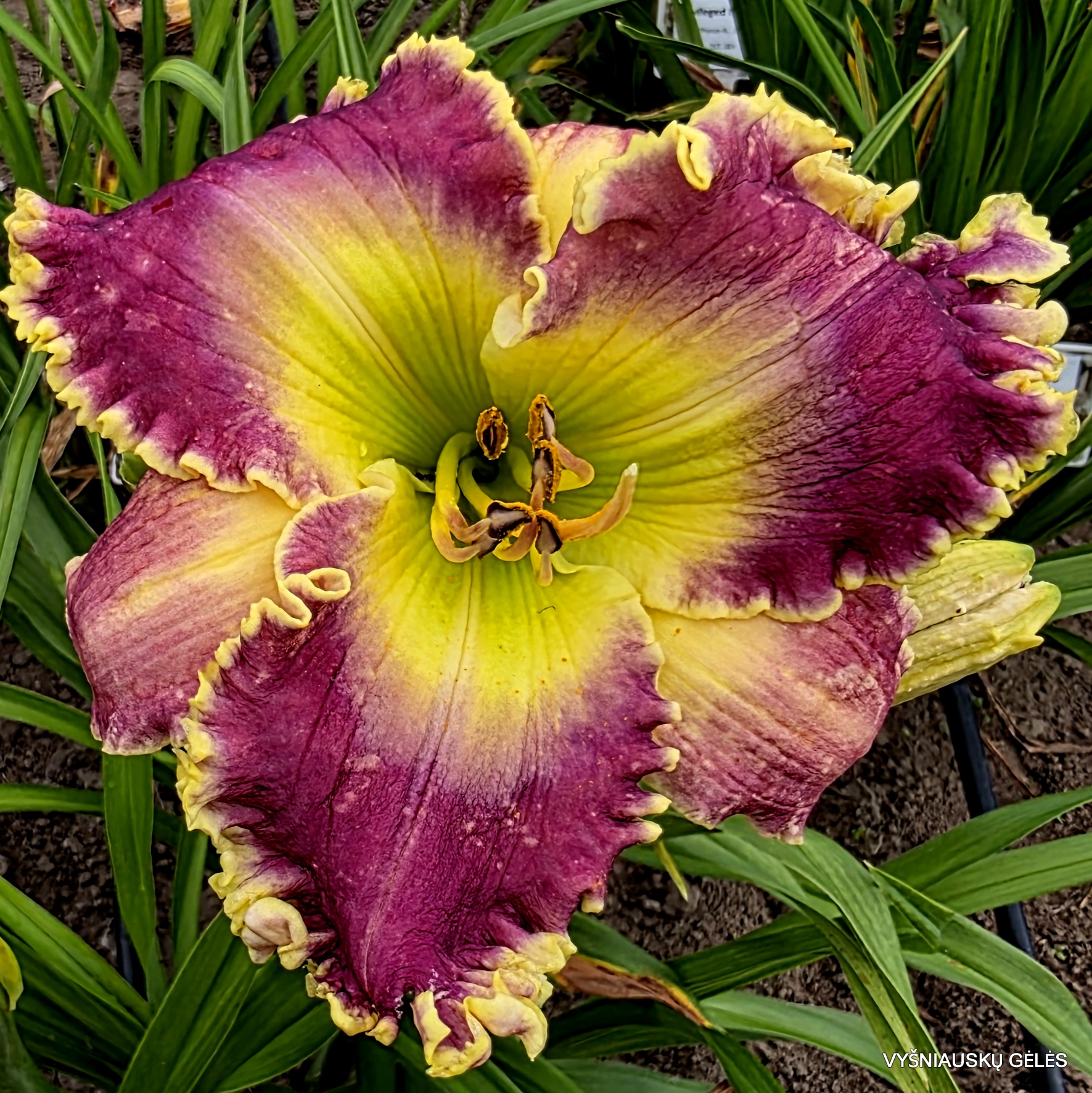 Žiedai dideli (19 cm skersmens) purpuriniai su vandenženkliu, gelsvai žaliu centru ir apvadu. A – 70 cm