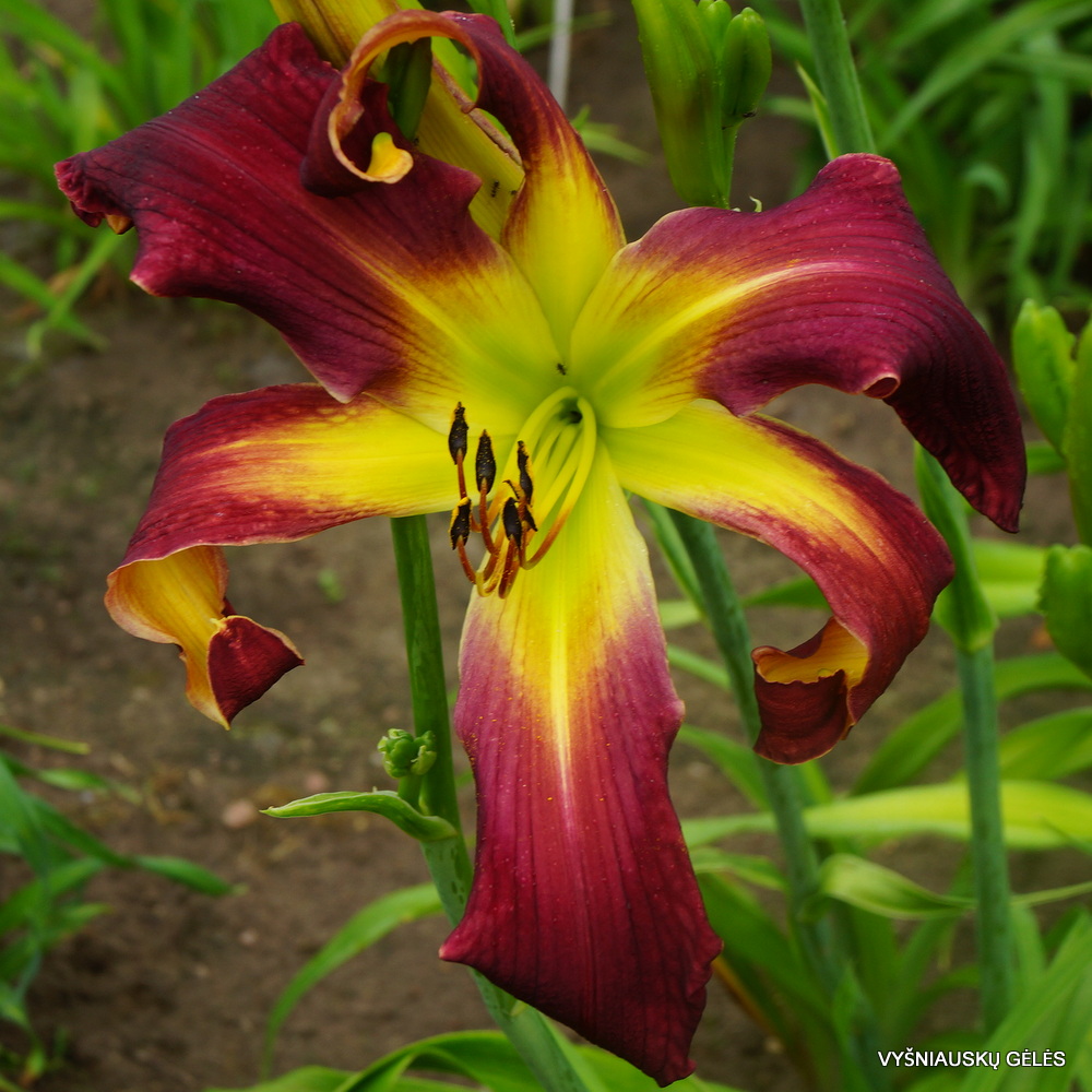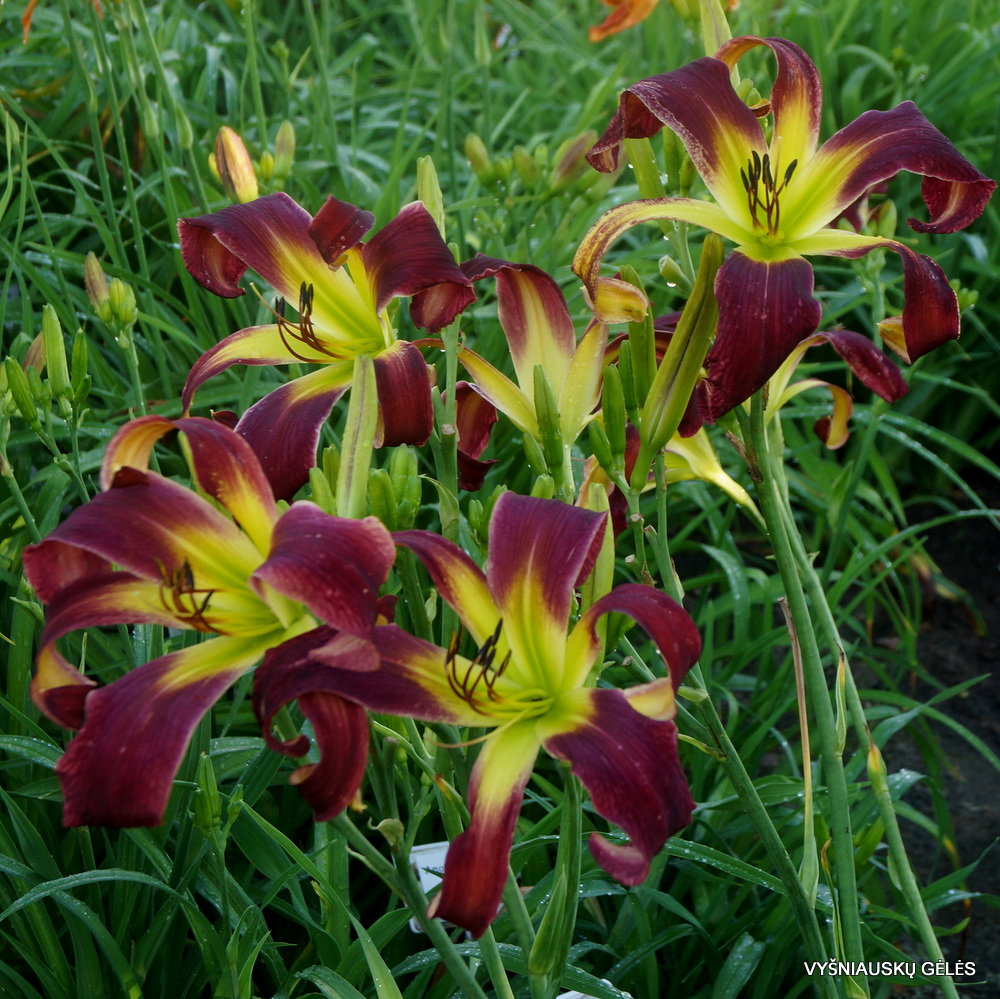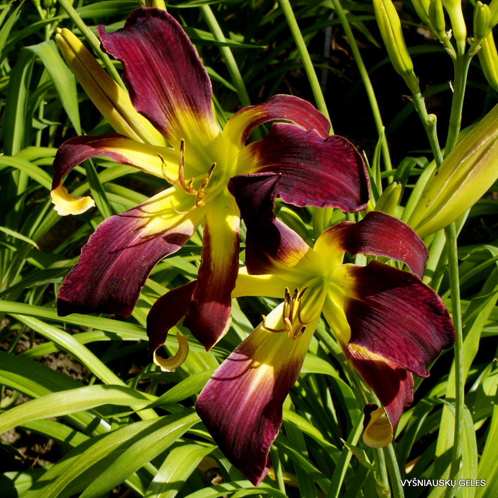 Žiedai didžiuliai (30 cm skersmens), violetiškai purpuriniai su gelsvai žaliu centru. A – 80 cm