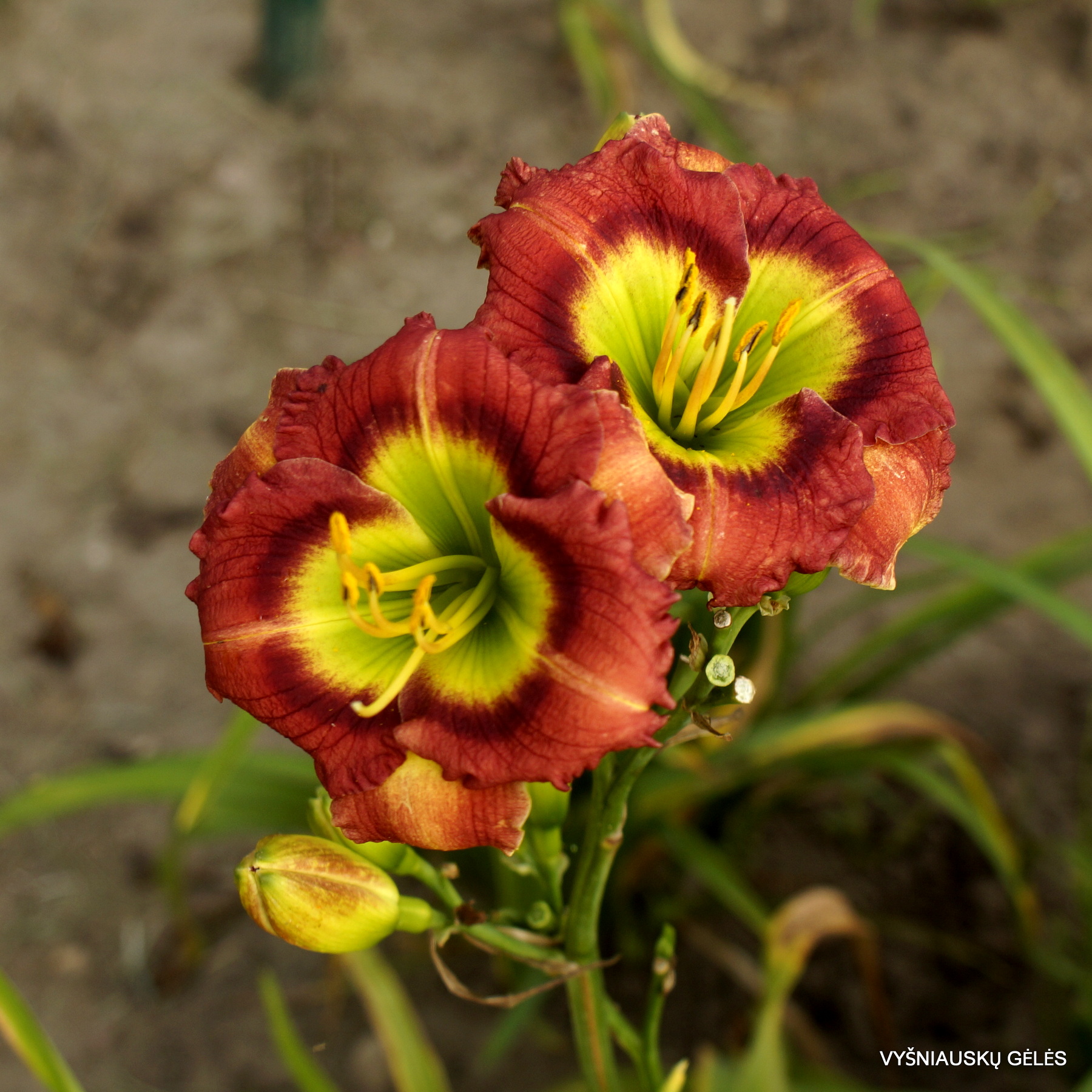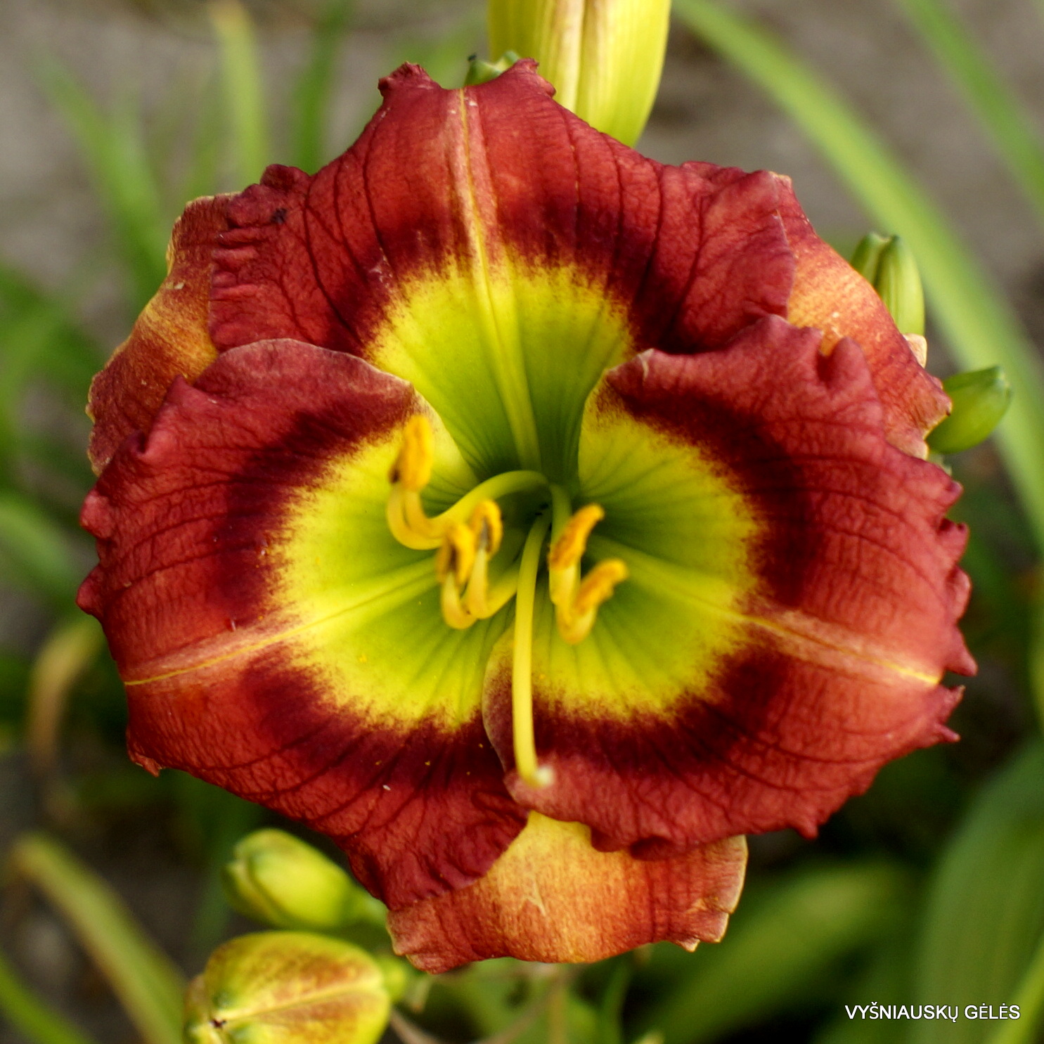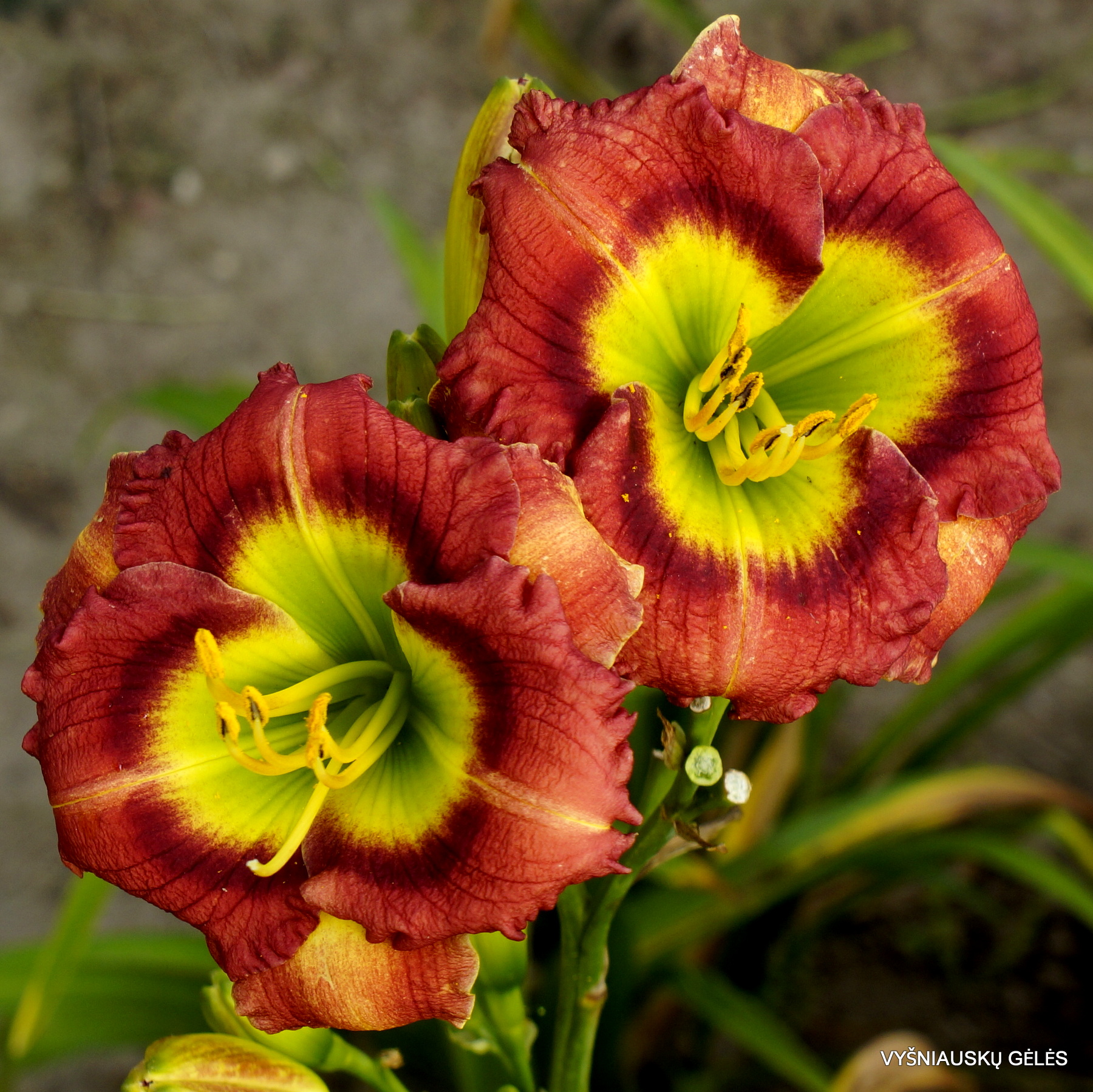 Žiedai maži (9 cm skersmens) labai apvalūs rožiškai raudoni su ryškesne akies juosta ir labai žaliu dideliu centru.