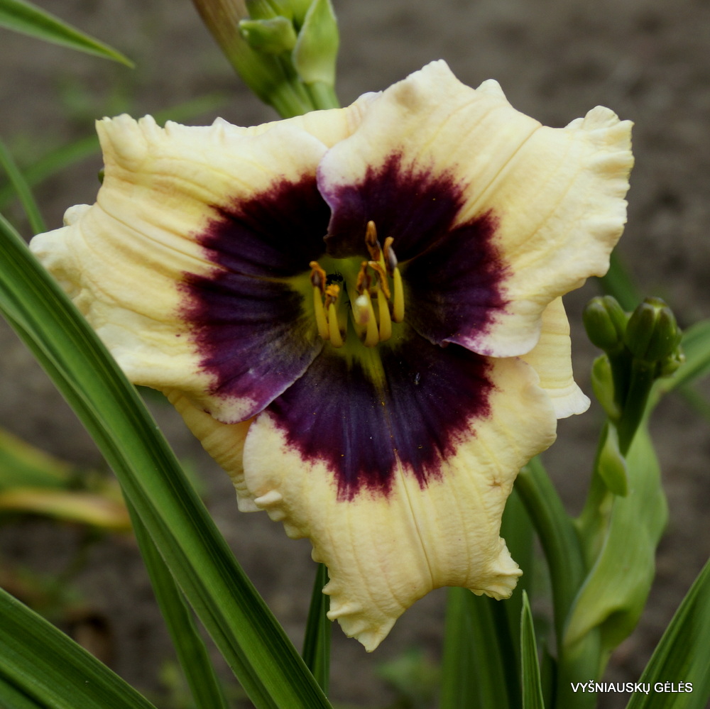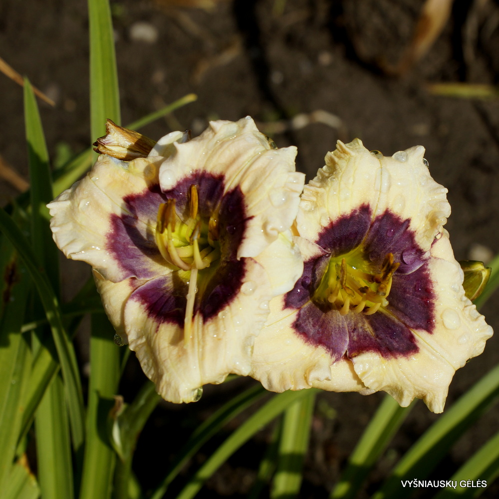 Žiedai maži (8 cm skersmens) kreminiai su tamsiai violetine akimi. A – 65 cm