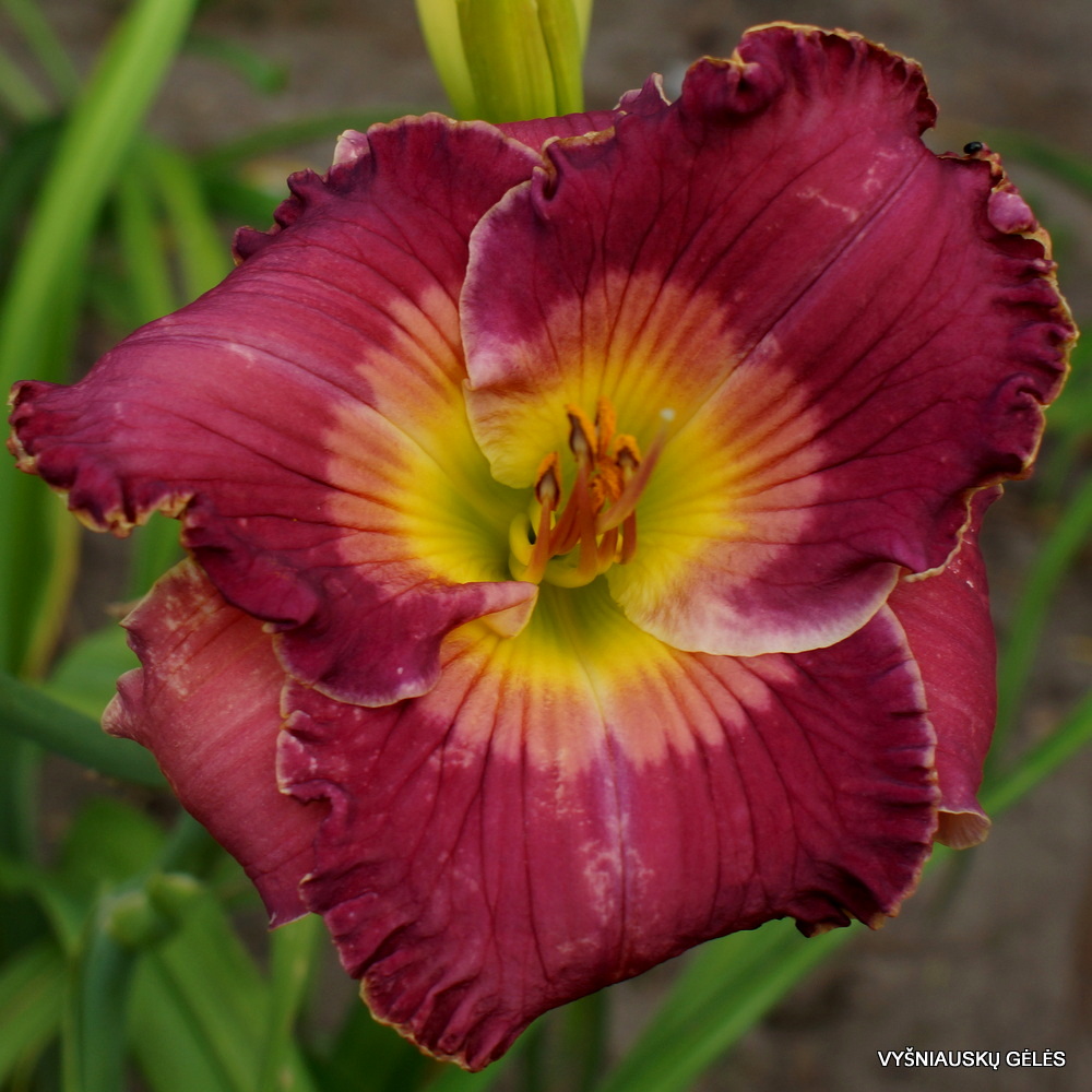 Žiedai vidutinio dydžio (15 cm skersmens) levandiškai purpuriniai su šviesia dėme aplink žalią centrą. A – 85 cm
