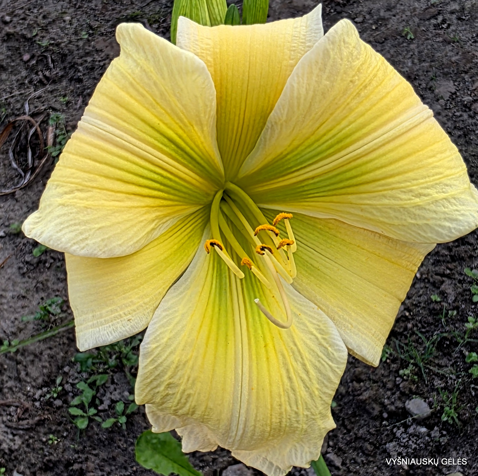 Žiedai 14 cm skersmens šviesiai gelsvi su dideliu žaliu centru. Per vainiklapių vidurį yra balta juosta.Taip pat jų pakraščiai iššviesėja iki baltos spalvos.