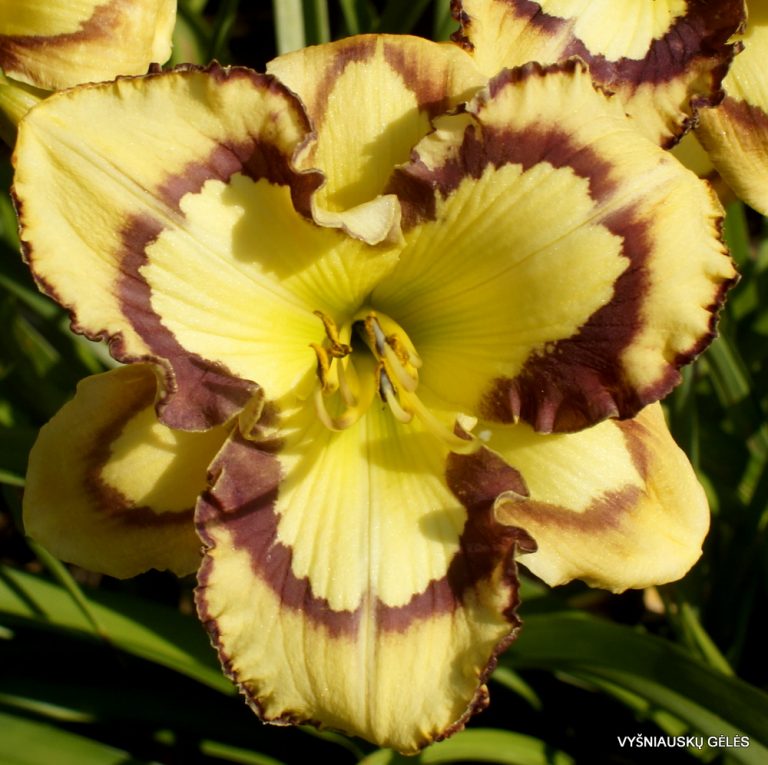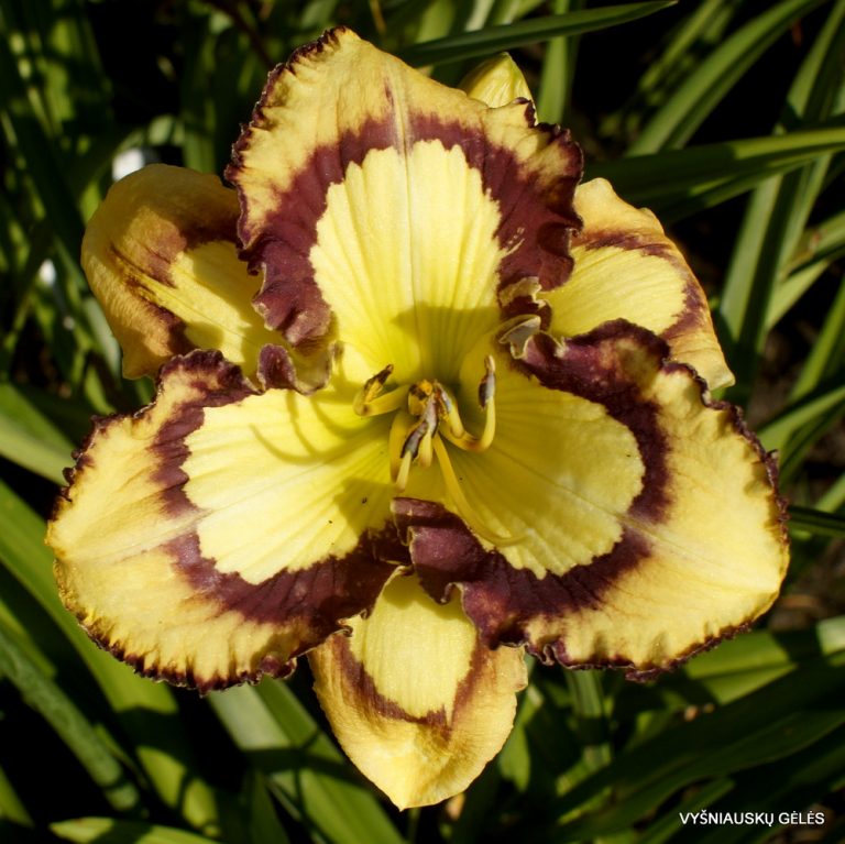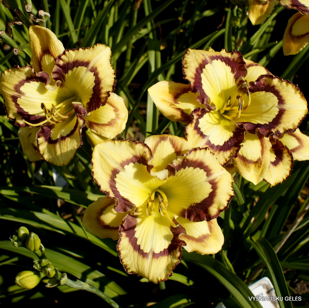 Žiedai vidutinio dydžio (15 cm skersmens) geltoni su kaštonine aplikacine dėme aplink ryškiai geltoną centrą. A – 65 cm