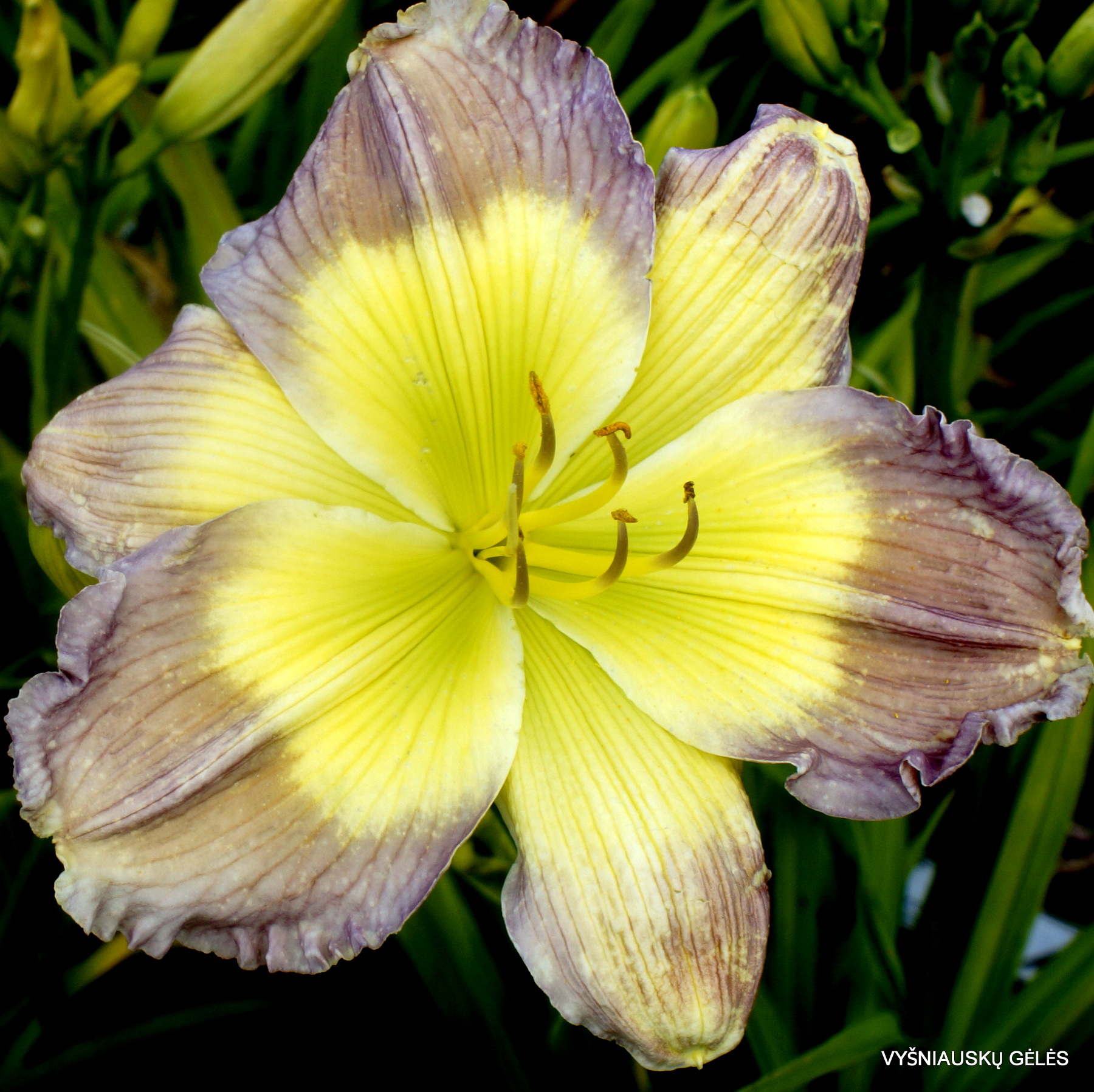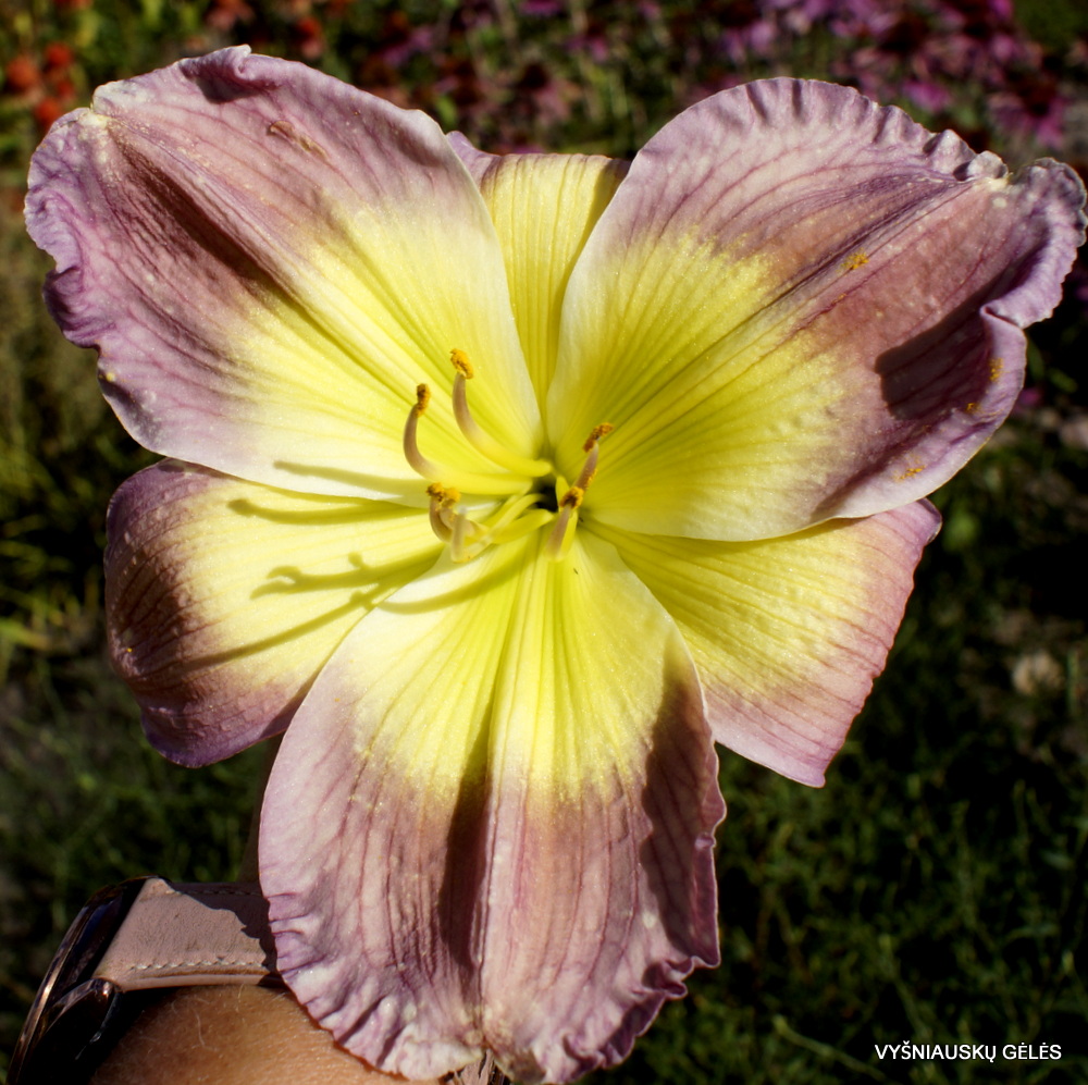 Žiedai nemaži (17 cm skersmens) levandiškai rožiniai su didžiule gelsvai žalia dėme. A – 80 cm
