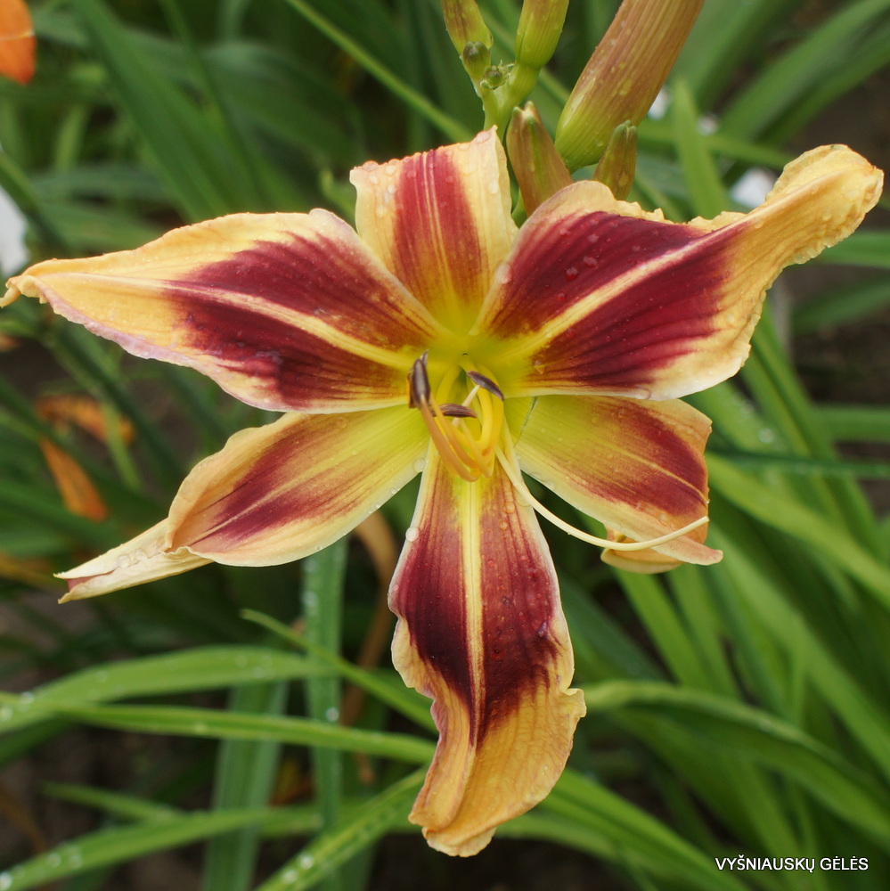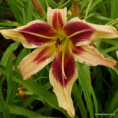 Žiedai nemaži (17 cm skersmens) kreminiai su didele raudonai purpurine dėme. A – 70 cm