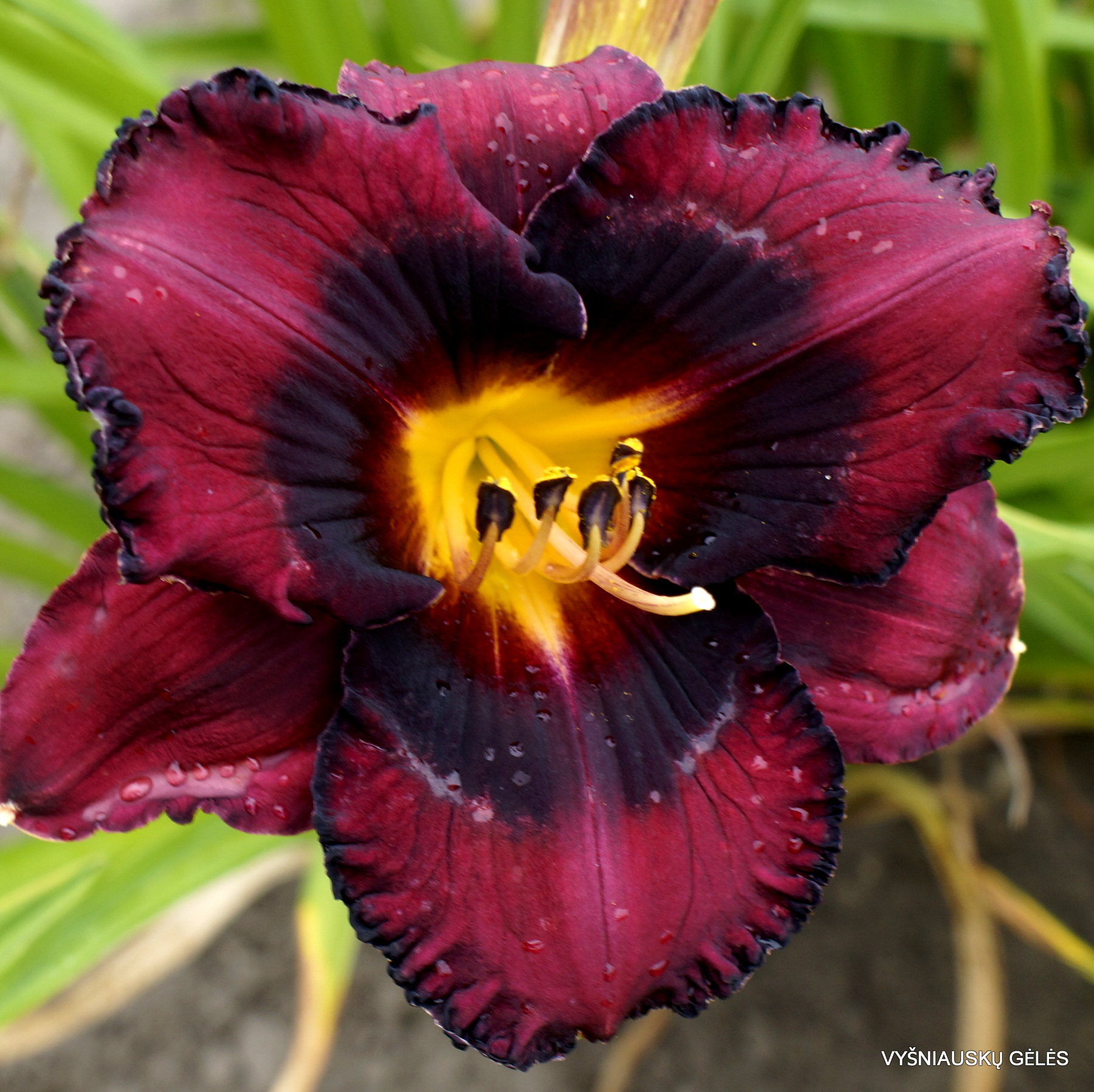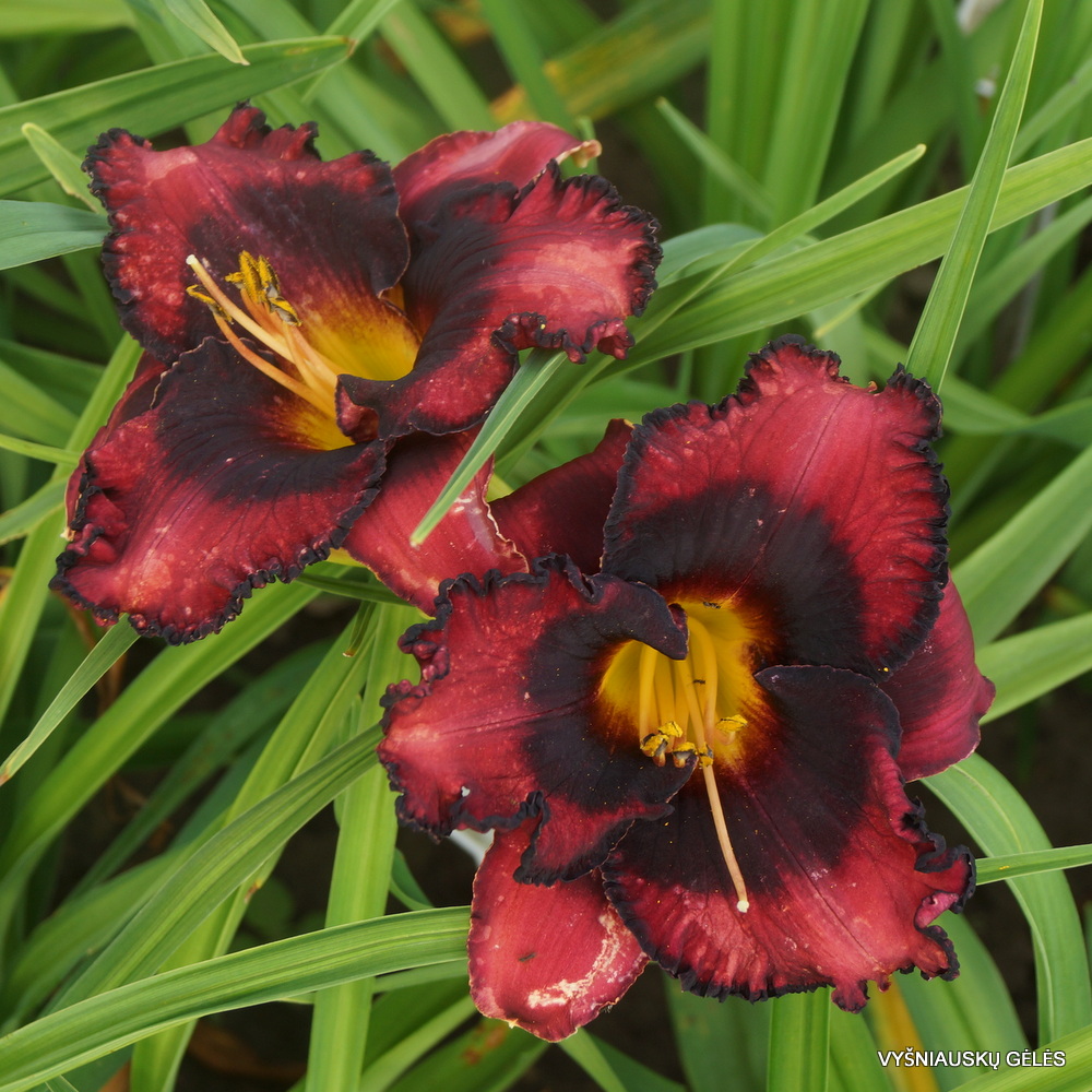 Žiedai vidutinio dydžio (14 cm skersmens) vyno raudonumo su juoda dėme. A – 65 cm