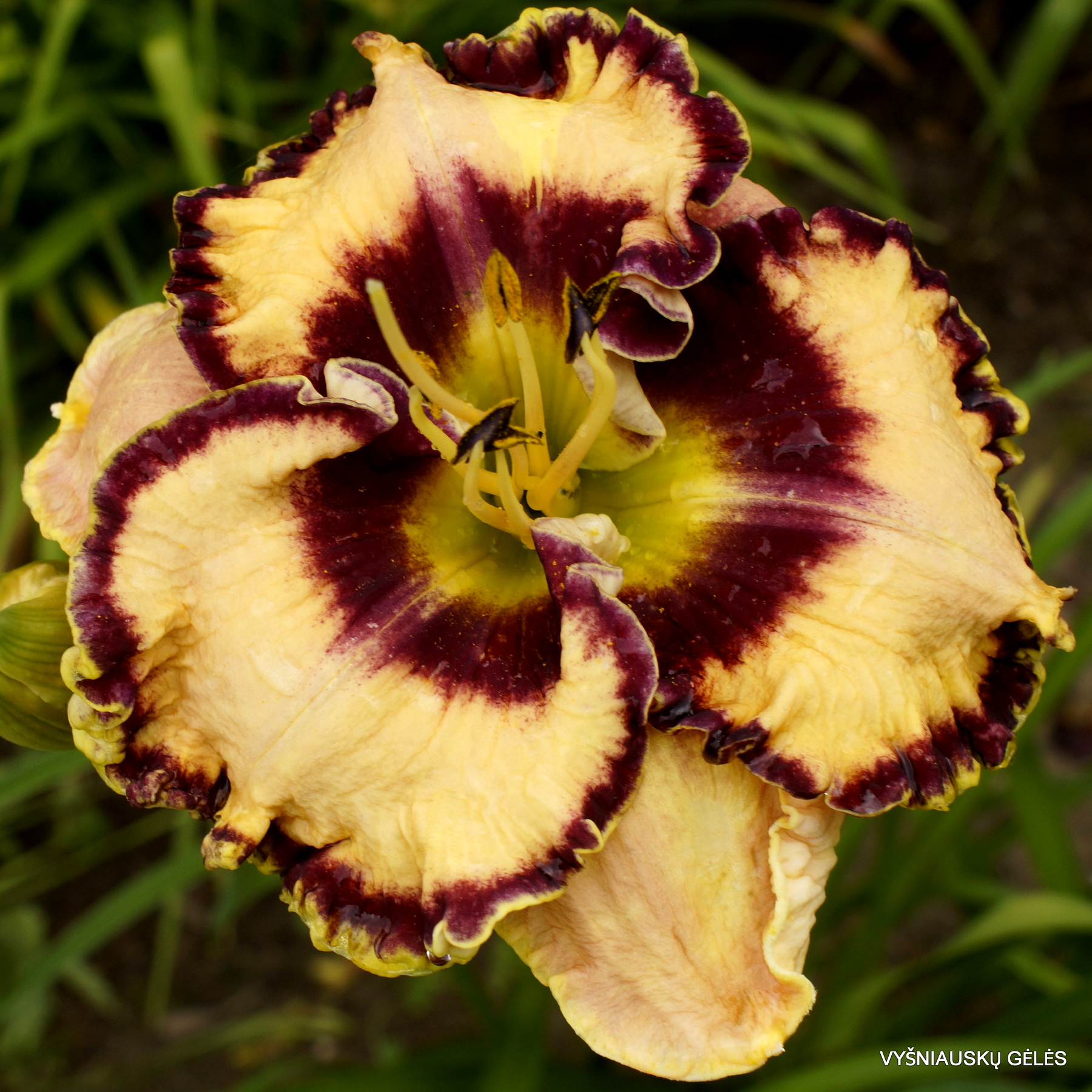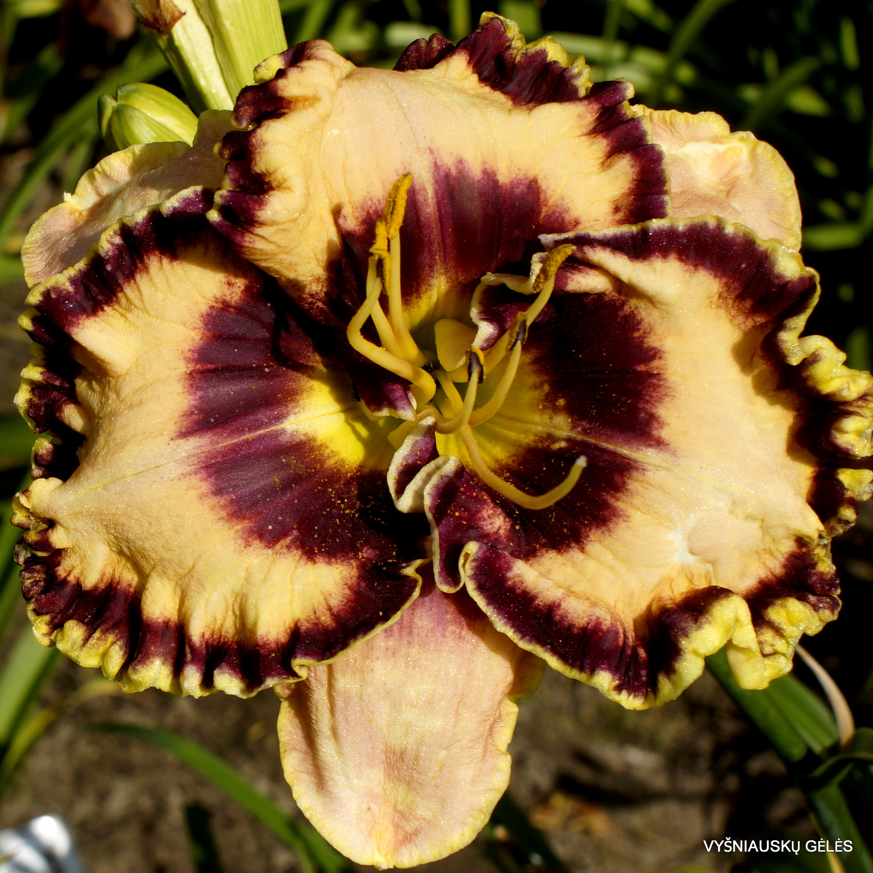 Žiedai nemaži (17 cm skersmens) kreminiai su raudonai purpurine akimi irapvadu. A – 115 cm
