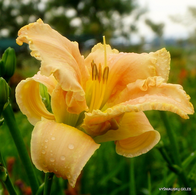 Žiedai skulptūriniai klostuoti, vidutinio dydžio (12,5 cm skersmens), persikiniai su rožiniu atspalviu. Labai įdomi veislė. A – 90 cm