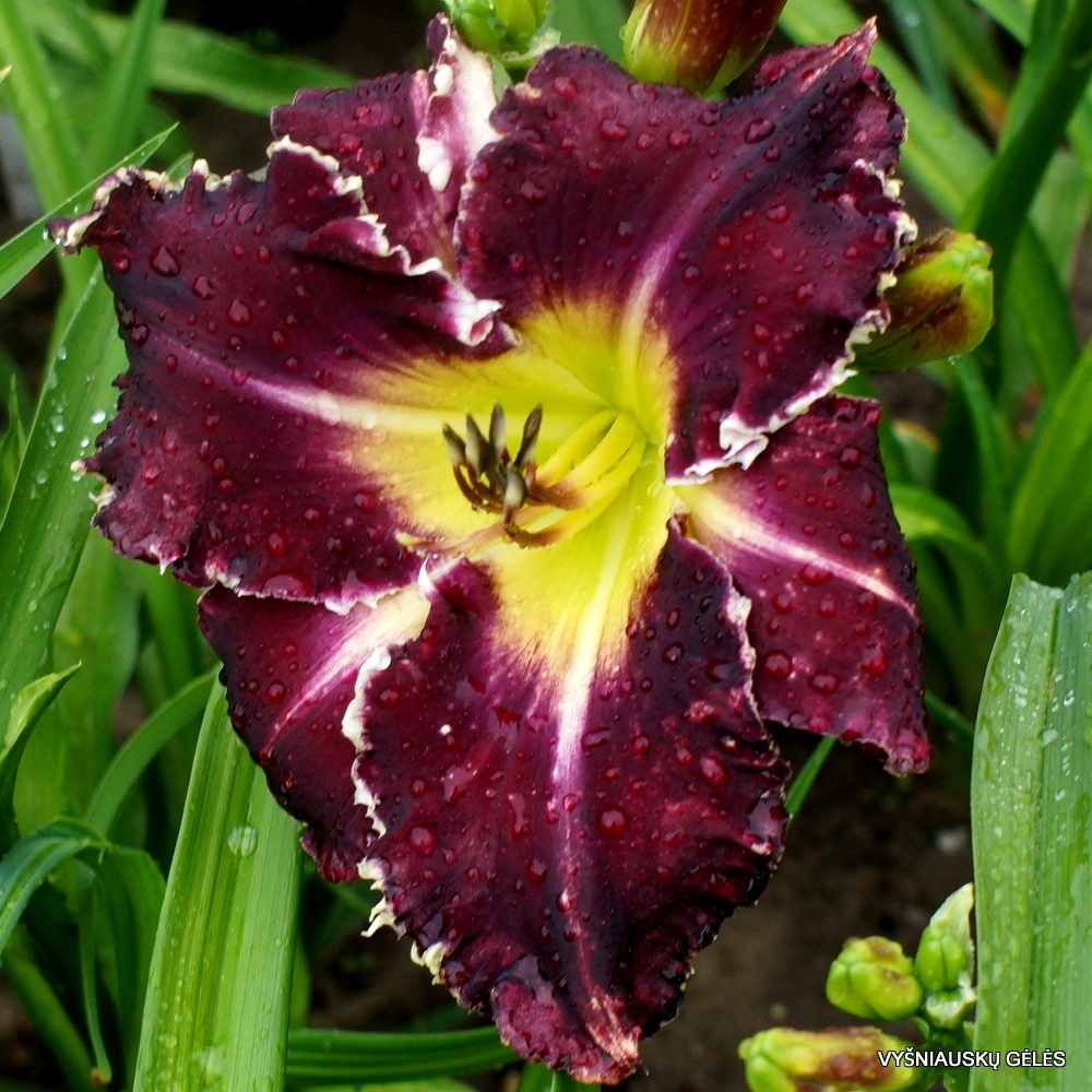 Žiedai dideli (18 cm skersmens), tamsiai purpuriniai su melsvai purpuriniu vandenženkliu ir garbanotais baltais pakraščiais. Žema. A – 50 cm